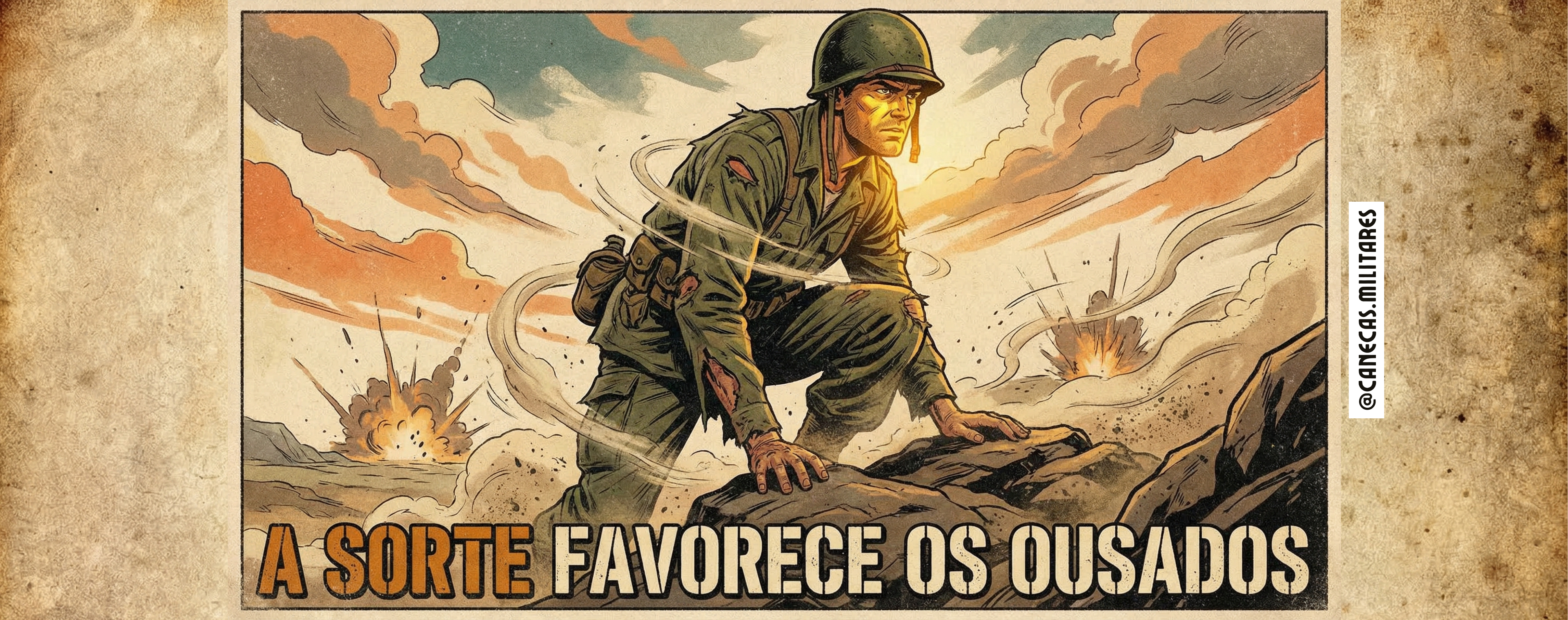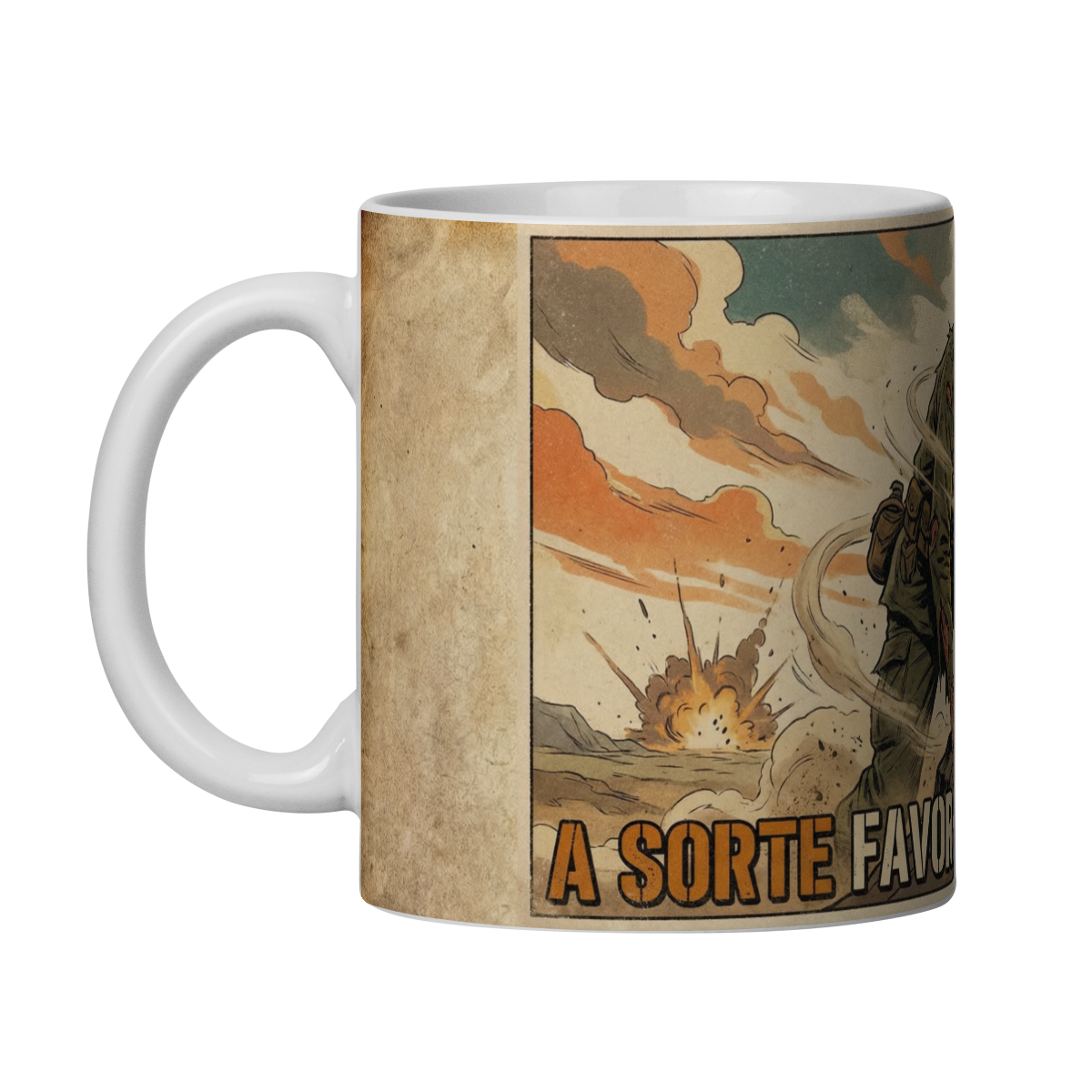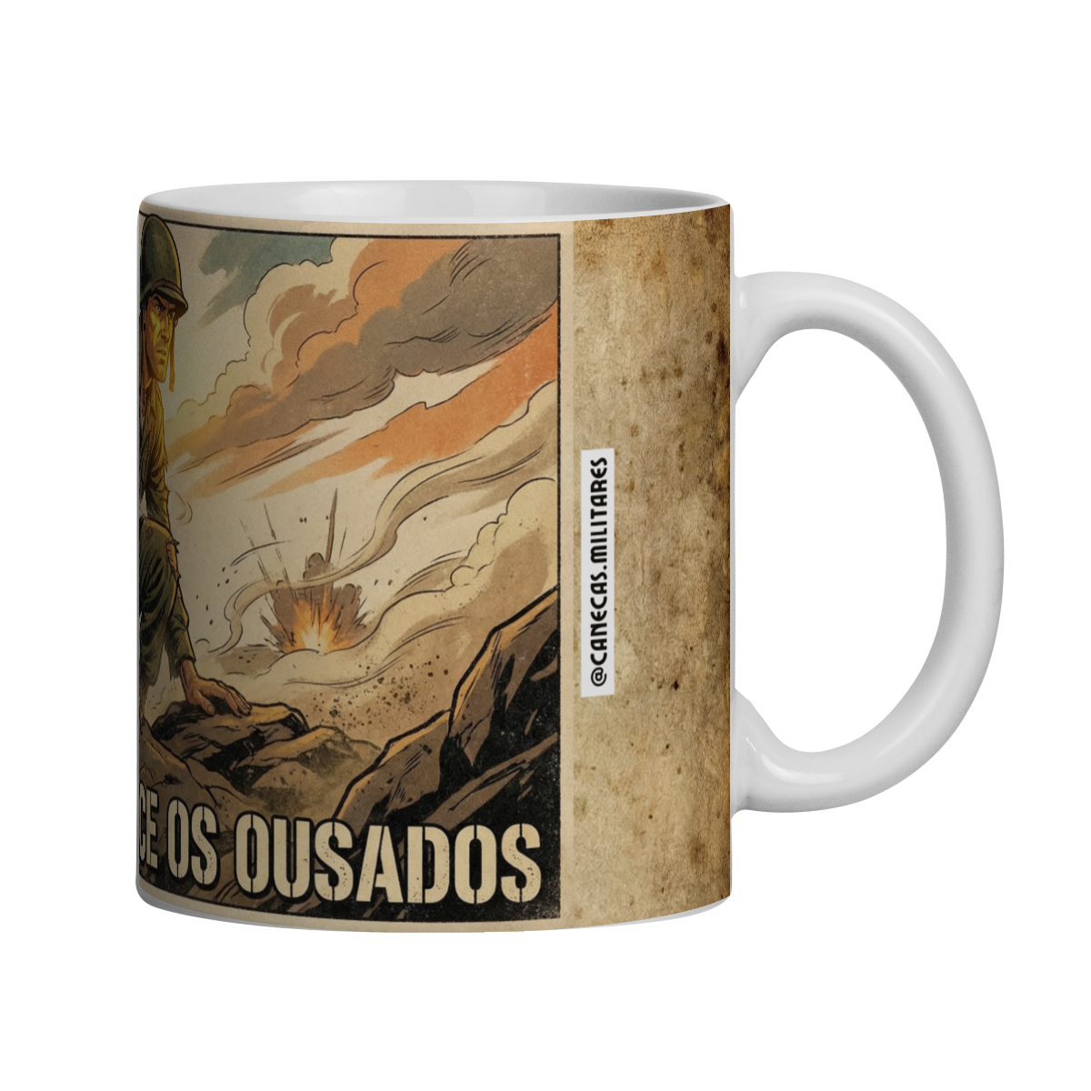 Essa caneca traz uma arte impactante no estilo HQ vintage, inspirada nos clássicos pôsteres militares das décadas de 50 e 60. A cena retrata um soldado avançando sob fogo, com expressão firme e olhar determinado, transmitindo coragem, resiliência e tomada de decisão em meio ao caos.