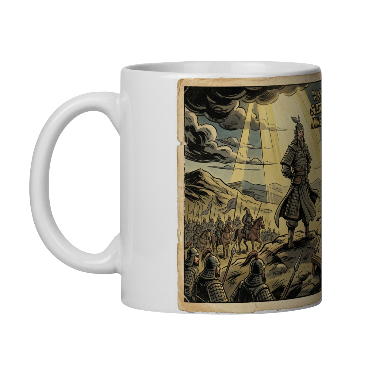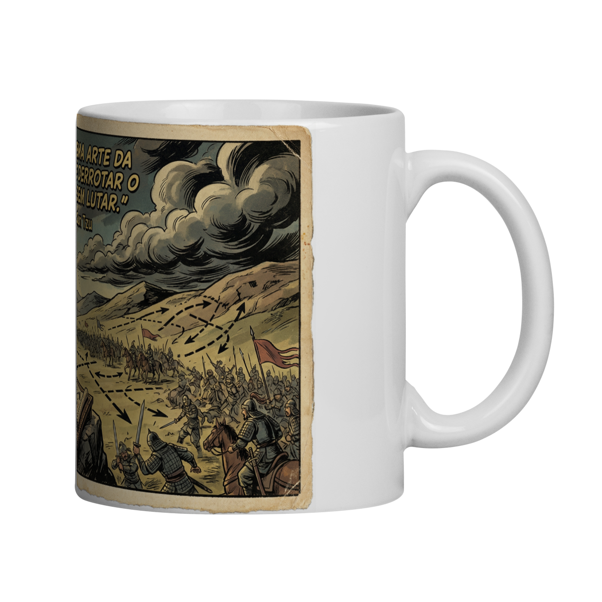 Essa caneca traz uma arte militar em estilo HQ retrô que simboliza domínio estratégico, inteligência e preparação. O estrategista observa do alto, enquanto o confronto se dissolve antes mesmo de começar. É a representação da verdadeira superioridade: vencer pelo planejamento, não pela força bruta.