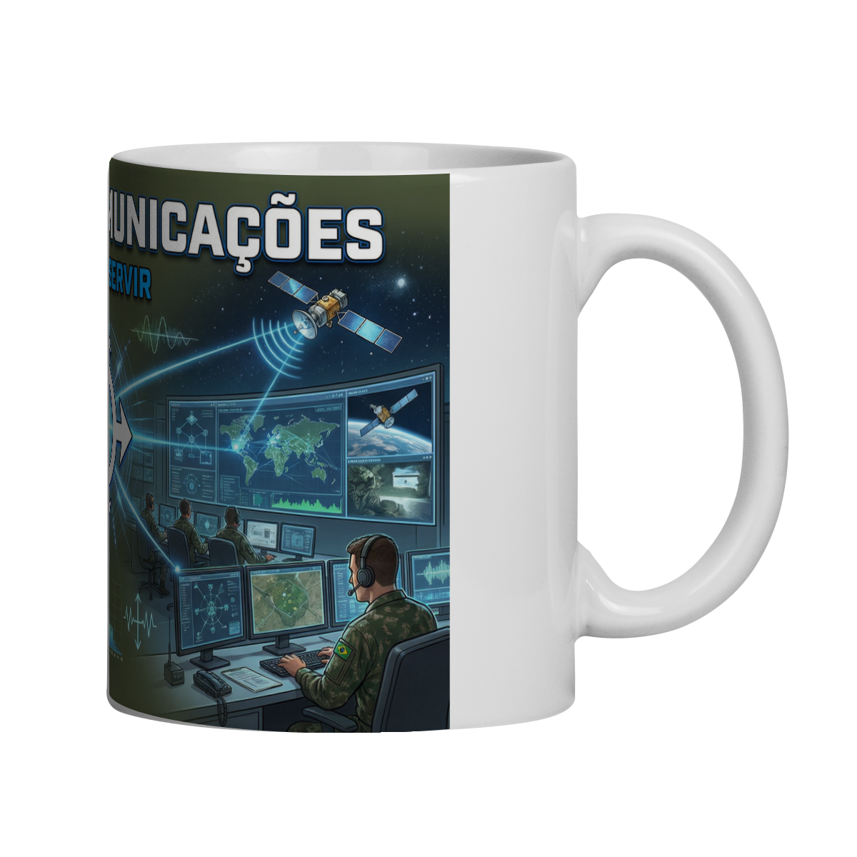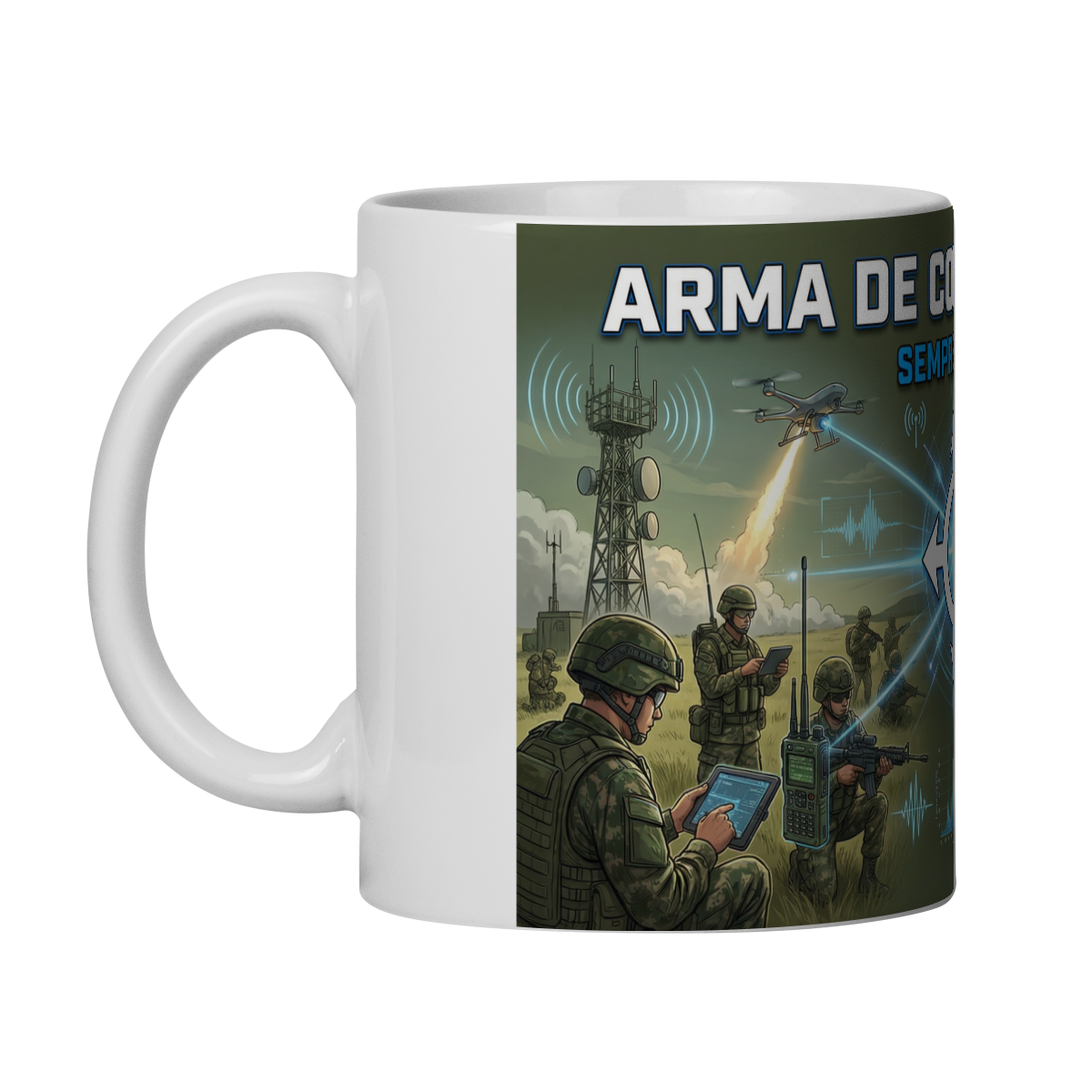 Esta caneca homenageia a Arma de Comunicações, responsável por conectar tropas, integrar operações e garantir que cada decisão seja tomada com precisão e tempo certo.