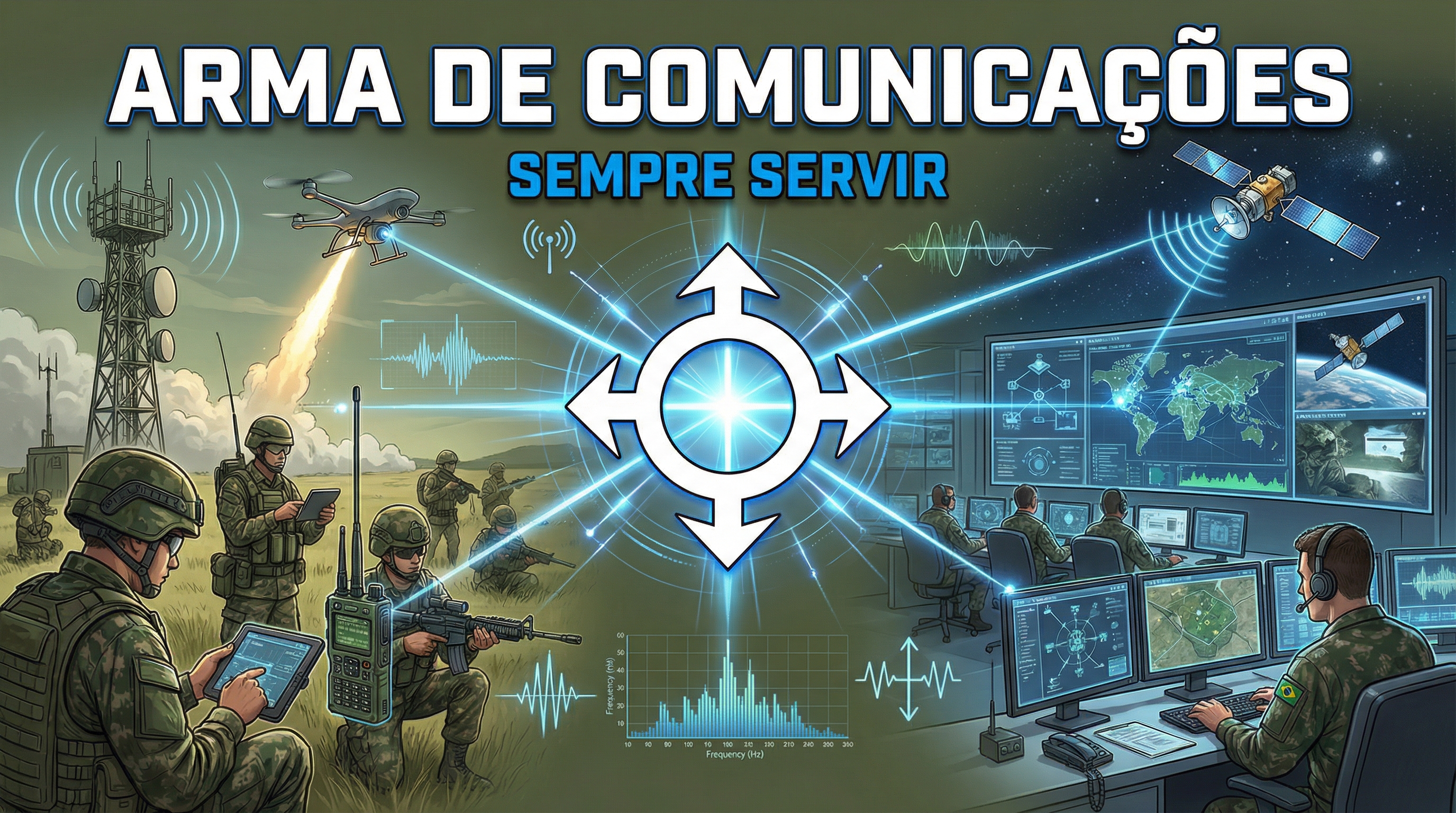 A arte representa a evolução da comunicação militar: operadores em campo, rádios táticos, antenas de transmissão, drones, satélites e centros de comando integrados por uma rede digital estratégica. No centro, o símbolo das Comunicações reforça a missão de ligação, coordenação e apoio permanente.