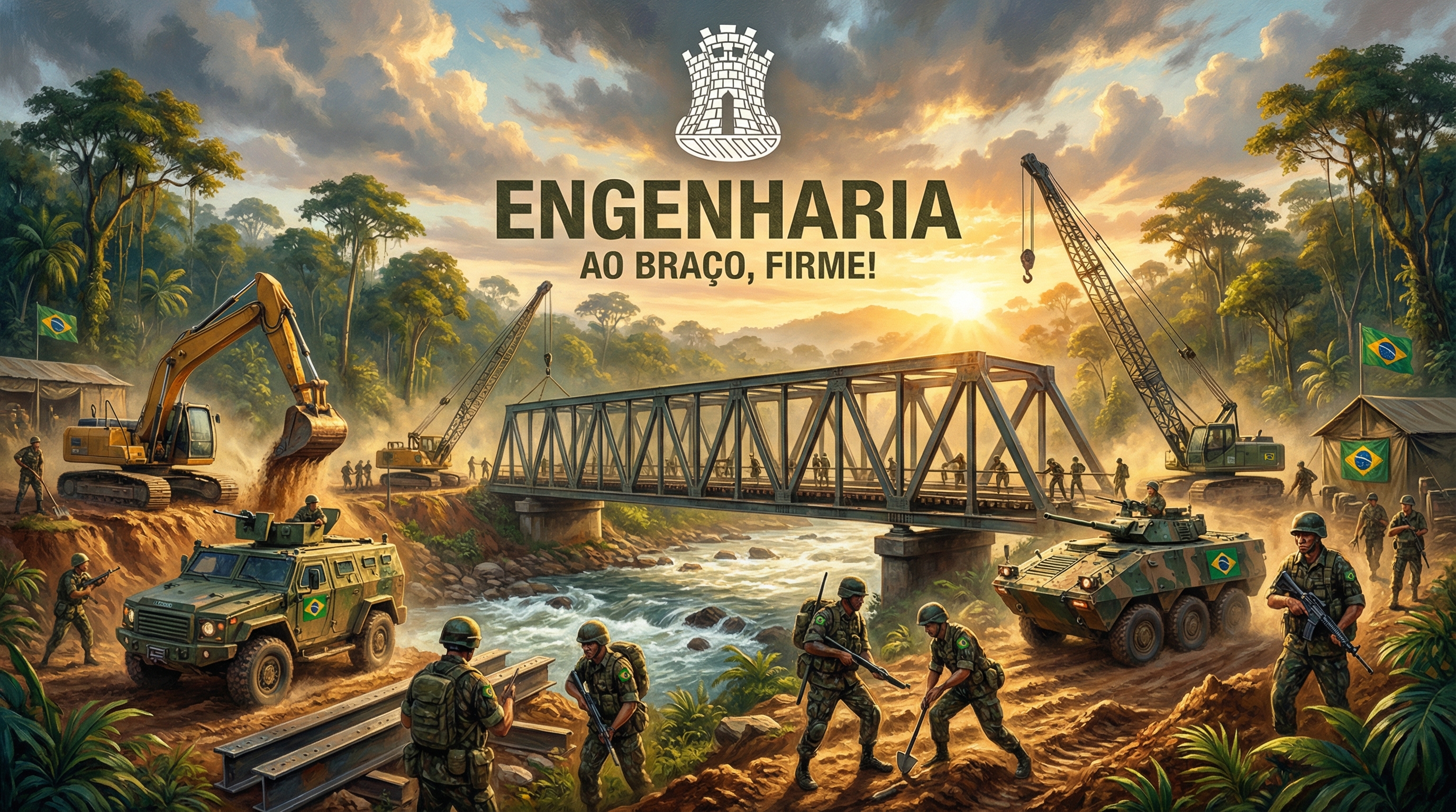 A arte retrata a Engenharia em ação: construção de ponte tática, operação de máquinas pesadas, blindados garantindo segurança e militares trabalhando com precisão em ambiente desafiador. Cada elemento simboliza capacidade técnica, coragem e apoio direto ao combate.