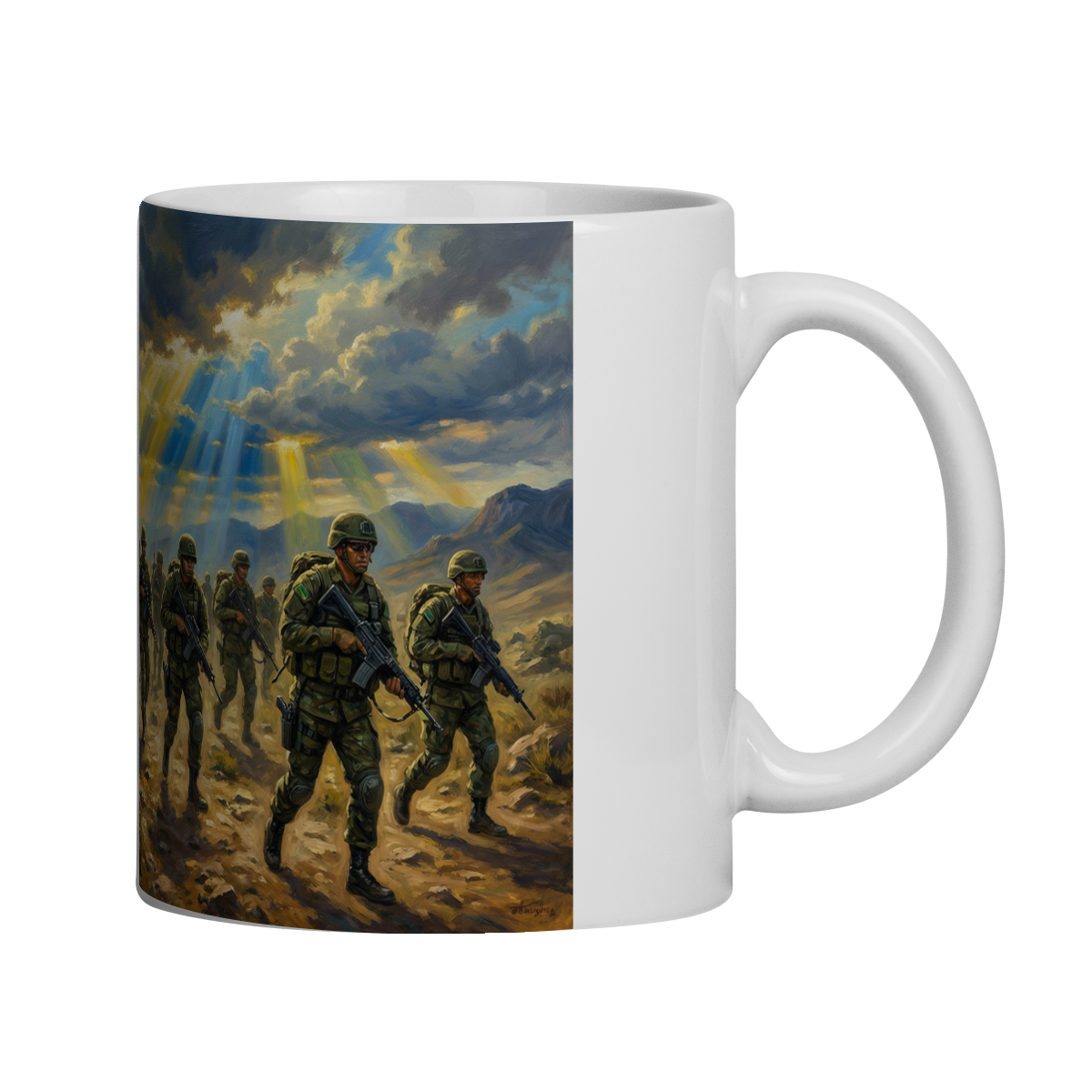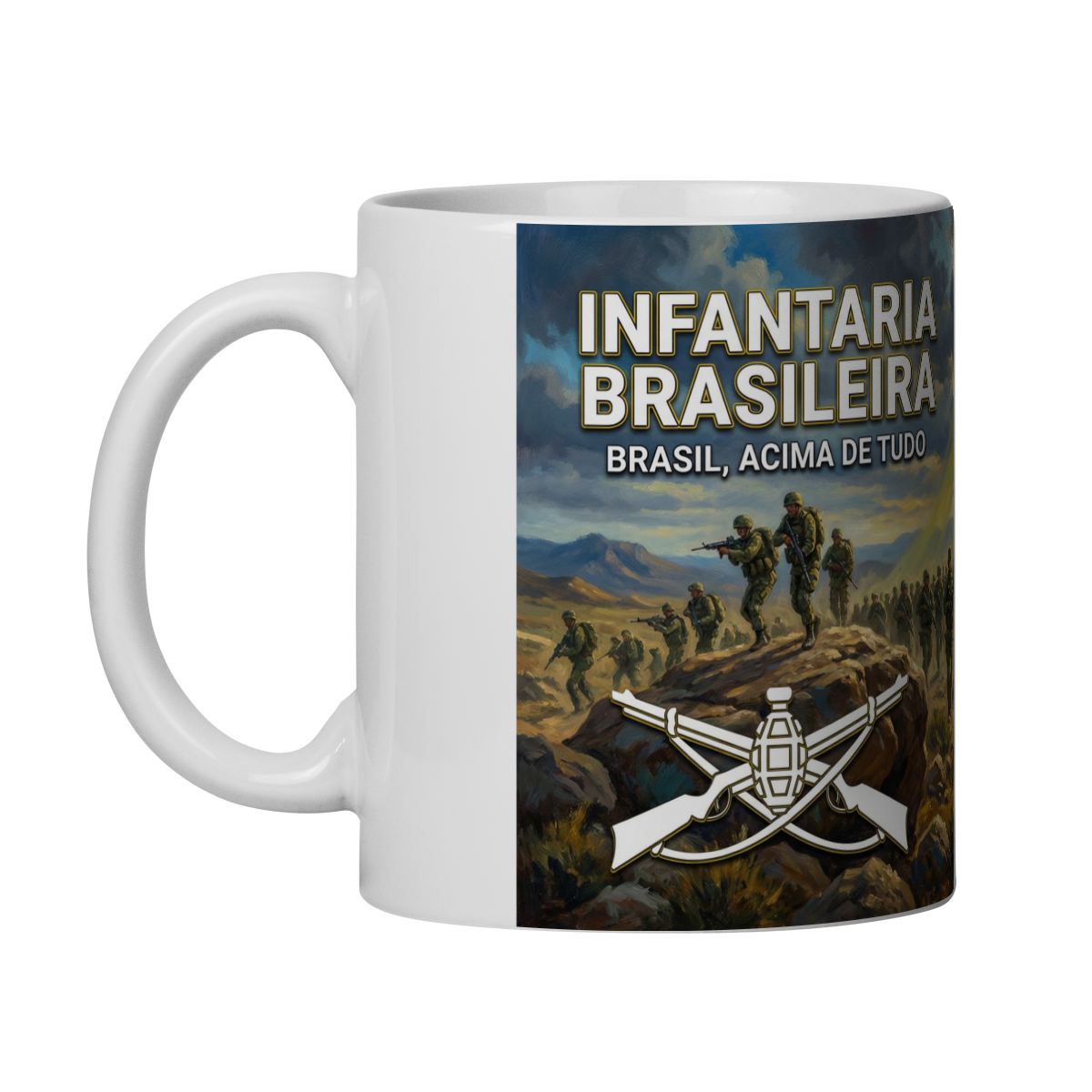 Esta caneca celebra a Arma de Infantaria, representada por uma tropa em progressão, determinada e disciplinada, sob a bandeira verde da arma. A imagem transmite força, coragem, espírito de corpo e compromisso com a Pátria.