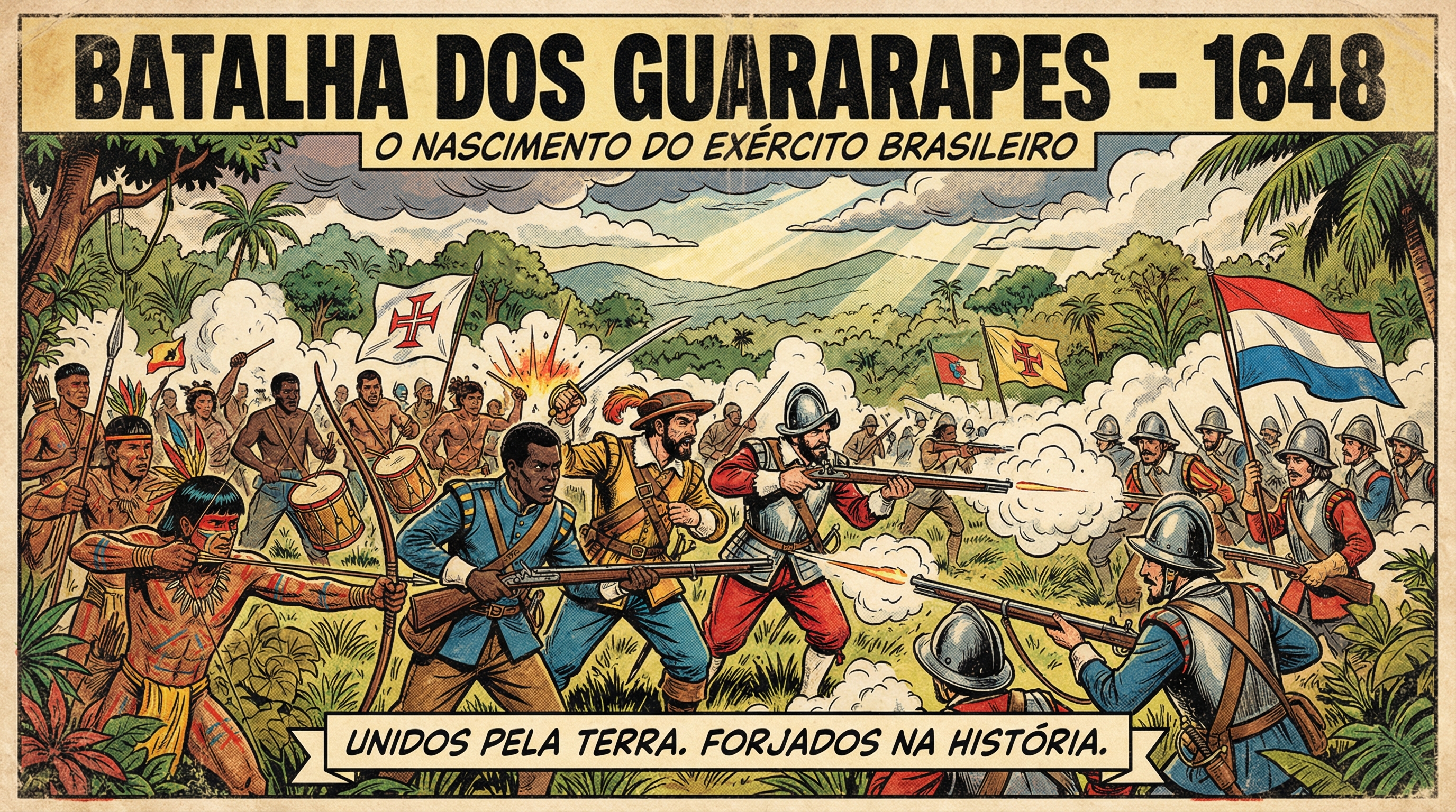 Com arte em estilo HQ retrô dos anos 50–60, a estampa retrata o combate nos Montes Guararapes, em Pernambuco, reunindo indígenas, negros e portugueses lutando lado a lado contra as forças invasoras, simbolizando coragem, resistência e identidade nacional.