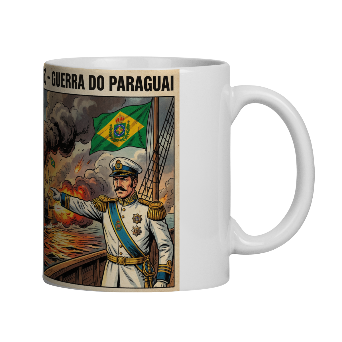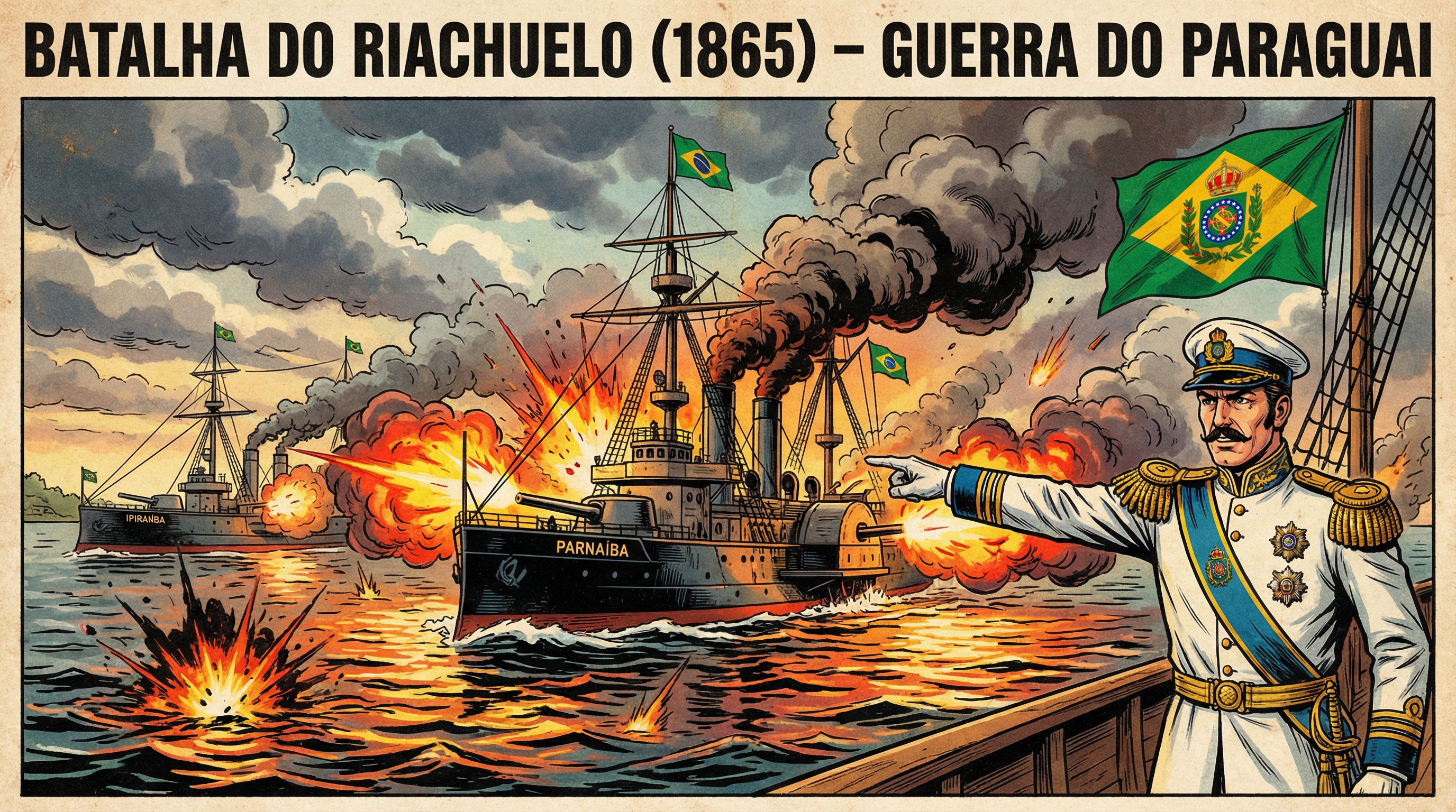 Com estilo inspirado nas HQs clássicas dos anos 50–60, a cena mostra os encouraçados brasileiros avançando sob fogo intenso, explosões refletindo nas águas do Rio Paraná e um oficial imperial conduzindo o combate com firmeza e honra. Ao fundo, a bandeira do Império do Brasil tremula como símbolo de coragem e soberania.