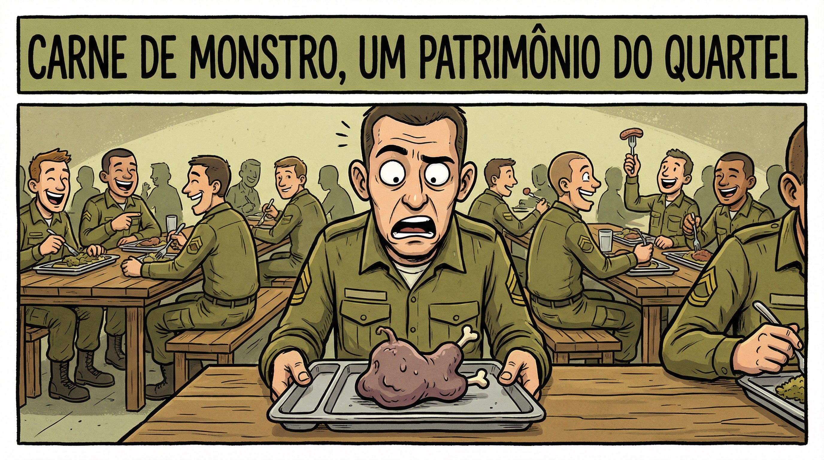 Nesta arte estilo HQ, o soldado encara o prato com aquele olhar de quem sabe que a missão do dia não é no campo… é no rancho. Enquanto a tropa ao fundo ri e segue firme, ele enfrenta o verdadeiro teste de resistência.