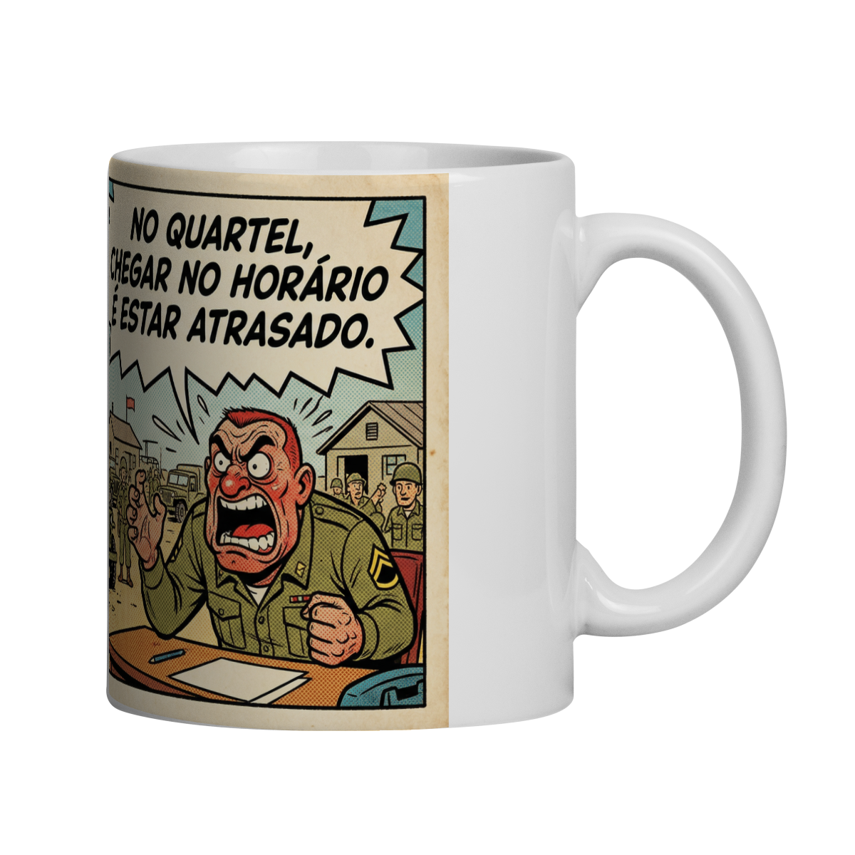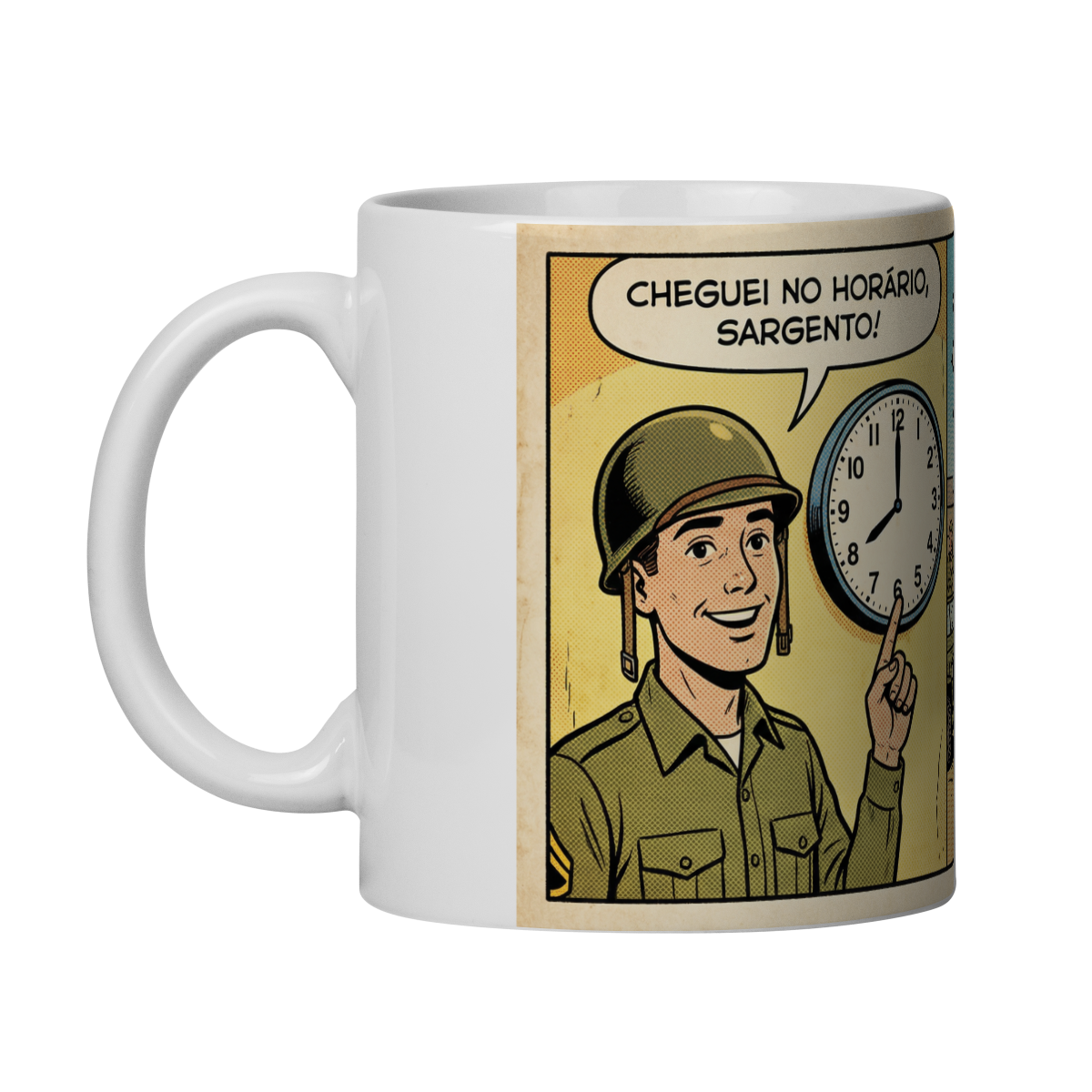 A caneca “No Quartel, Chegar no Horário é Estar Atrasado” traz uma ilustração em estilo HQ retrô inspirada nos quadrinhos clássicos das décadas de 50 e 60. A arte mostra um momento típico da rotina militar: o recruta orgulhoso por ter chegado no horário e o sargento lembrando uma das máximas mais conhecidas da vida de quartel.
