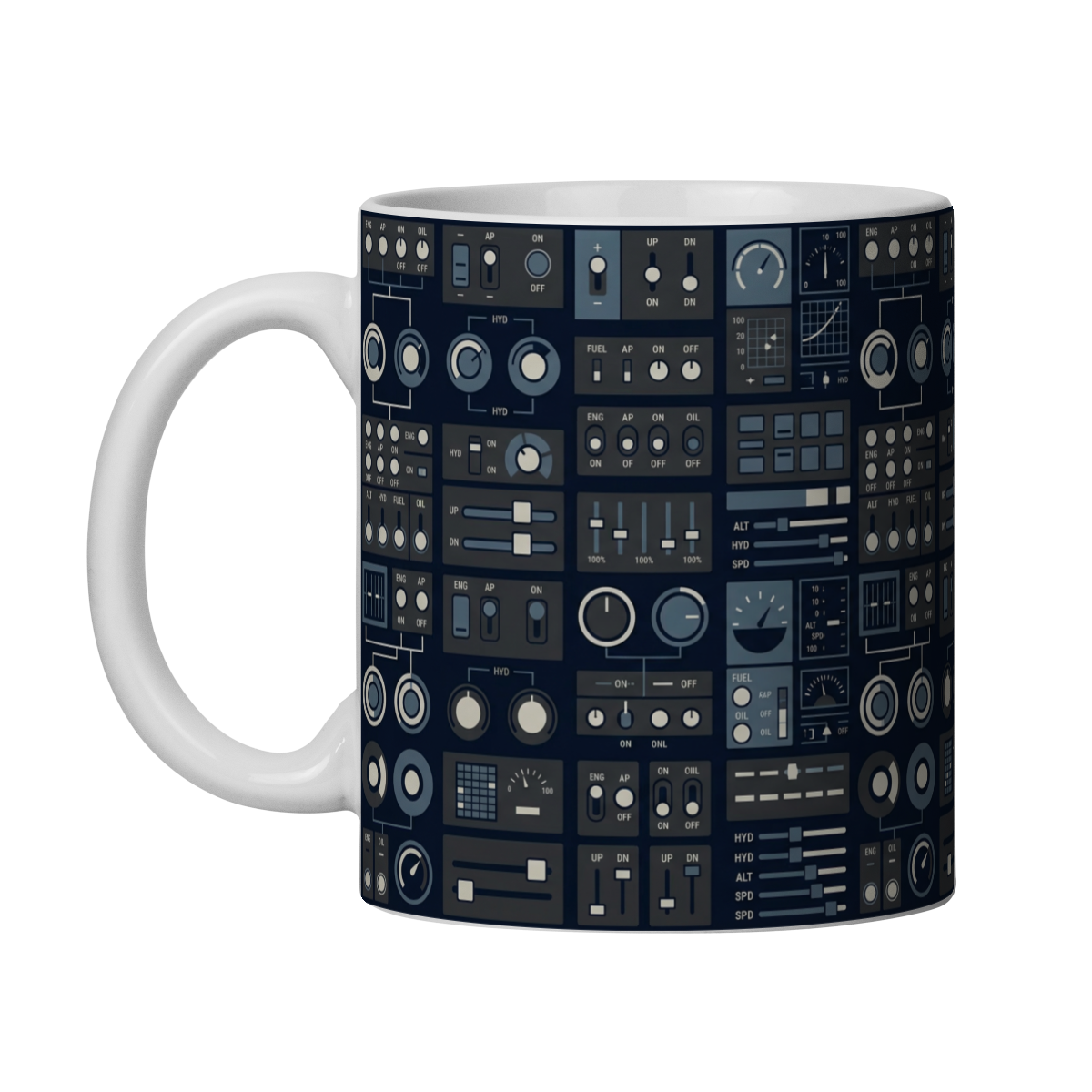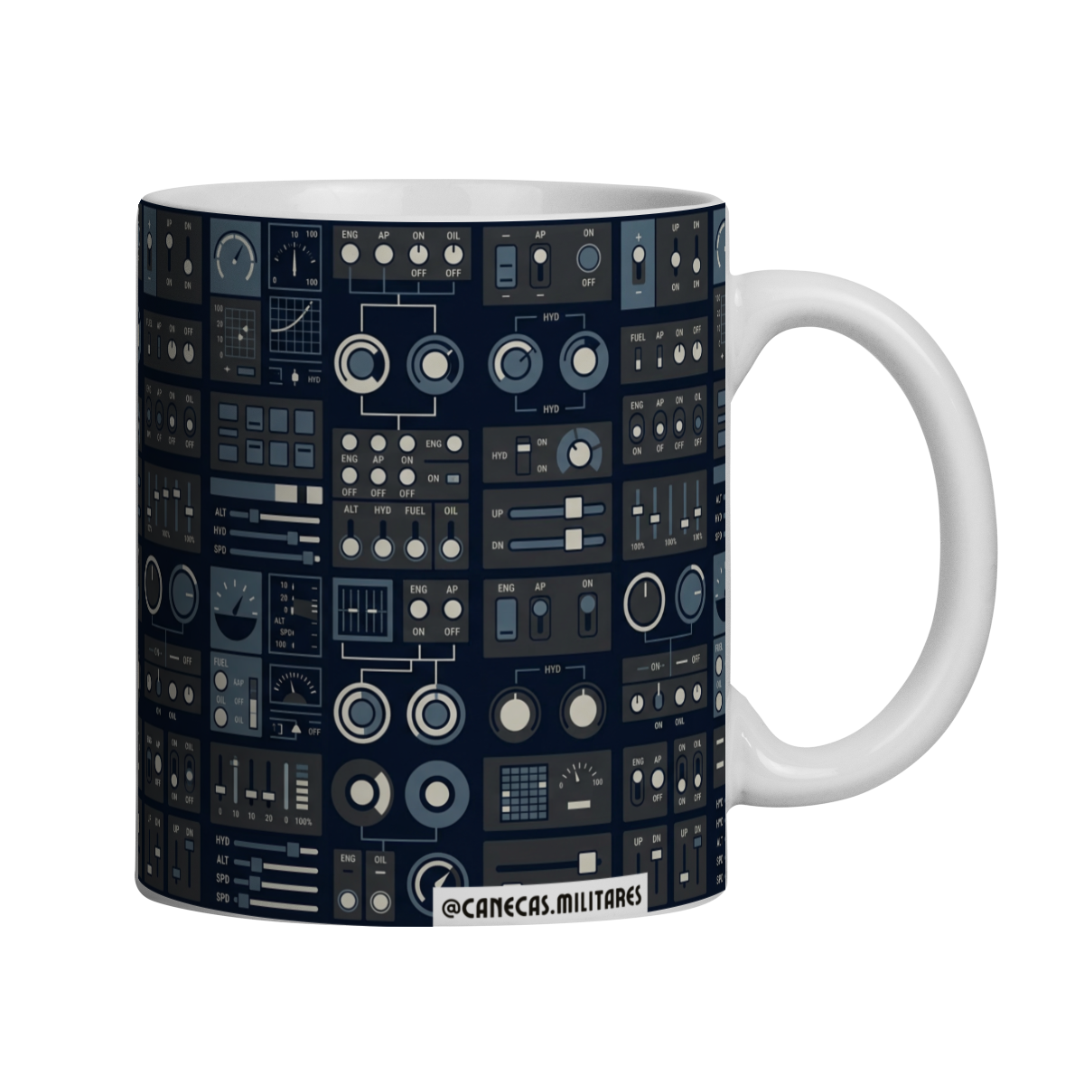 Essa caneca traz a essência dos painéis de aeronaves em um design inspirado nos cockpits clássicos, combinando botões, indicadores e comandos em uma composição visual rica e envolvente.