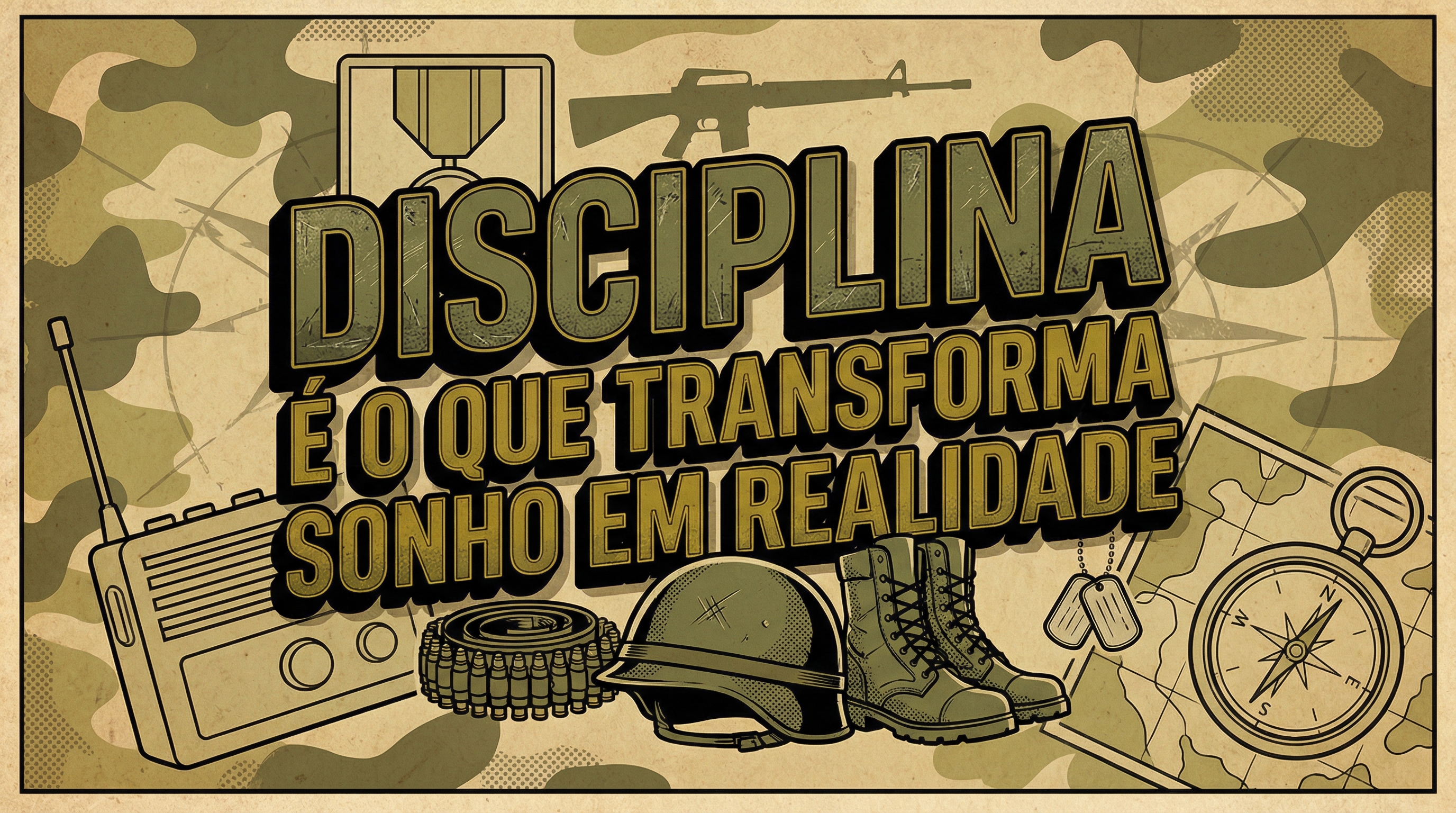 Com arte em estilo HQ retrô dos anos 50–60, inspirada em pôsteres militares clássicos, a estampa reúne símbolos da vida operacional — rádio, capacete, coturno, munição, bússola, mapa e identificação — reforçando a importância do preparo, da organização e da estratégia para transformar objetivos em resultados concretos.