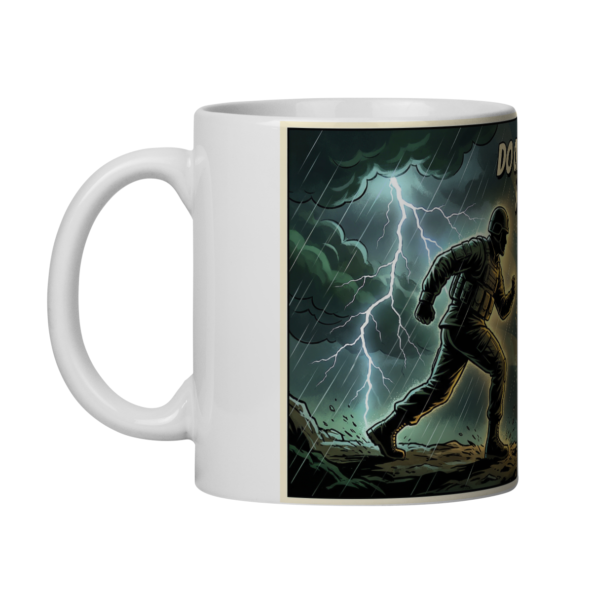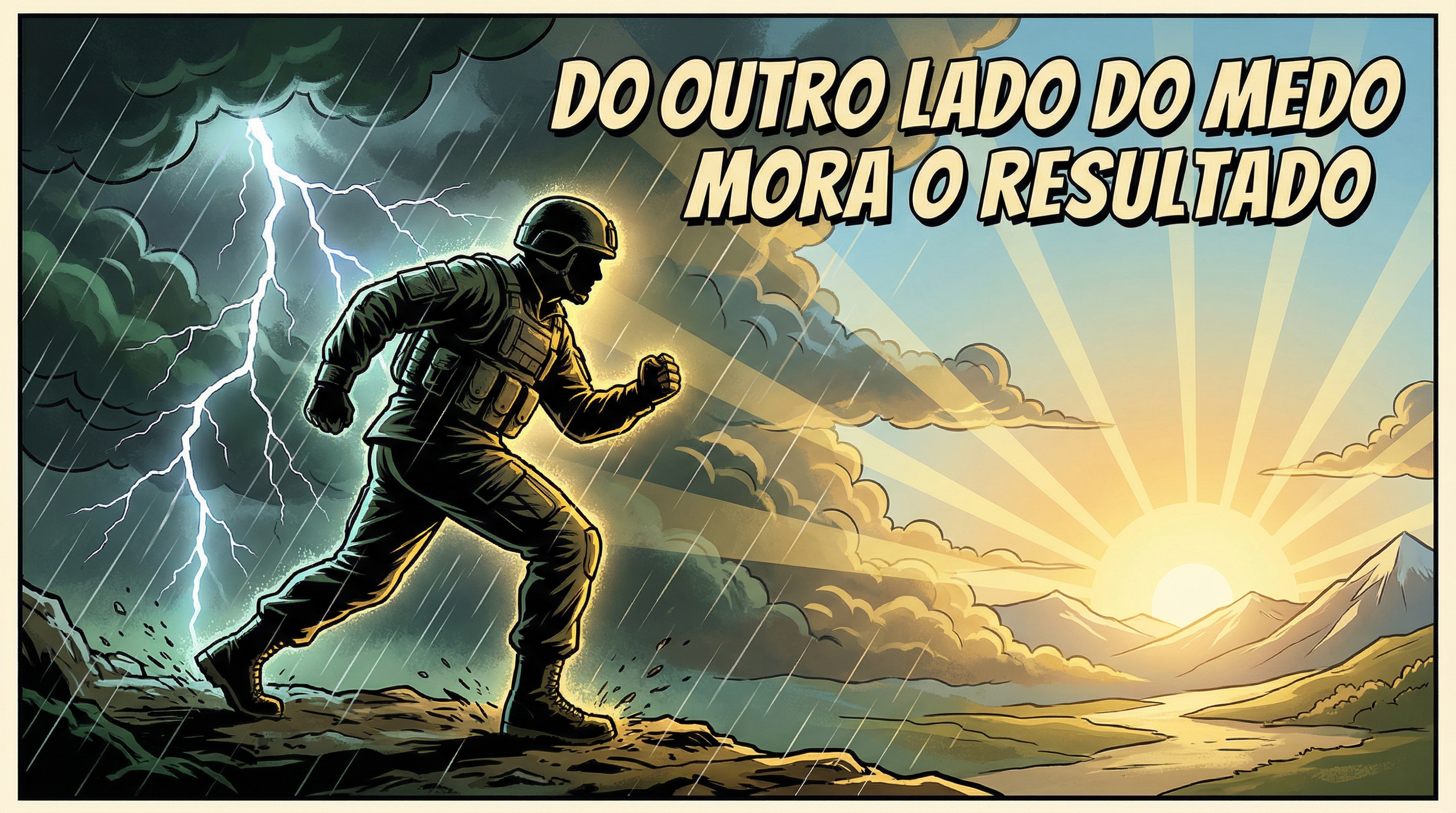 Uma silhueta militar atravessando a linha entre a sombra e a luz — símbolo claro de coragem, disciplina e superação.