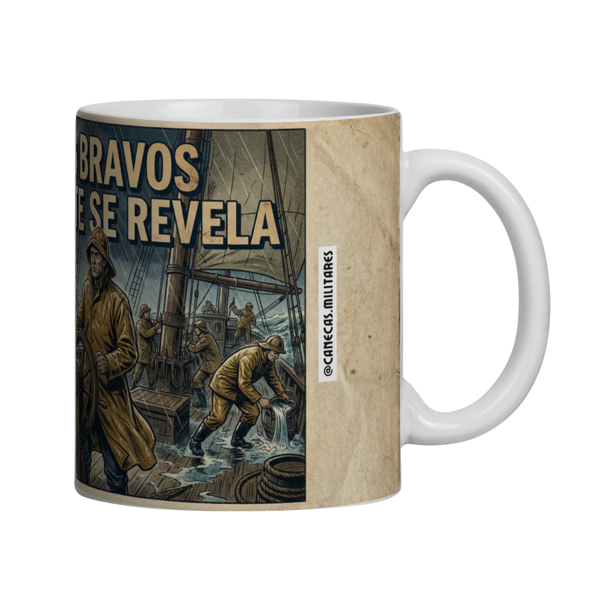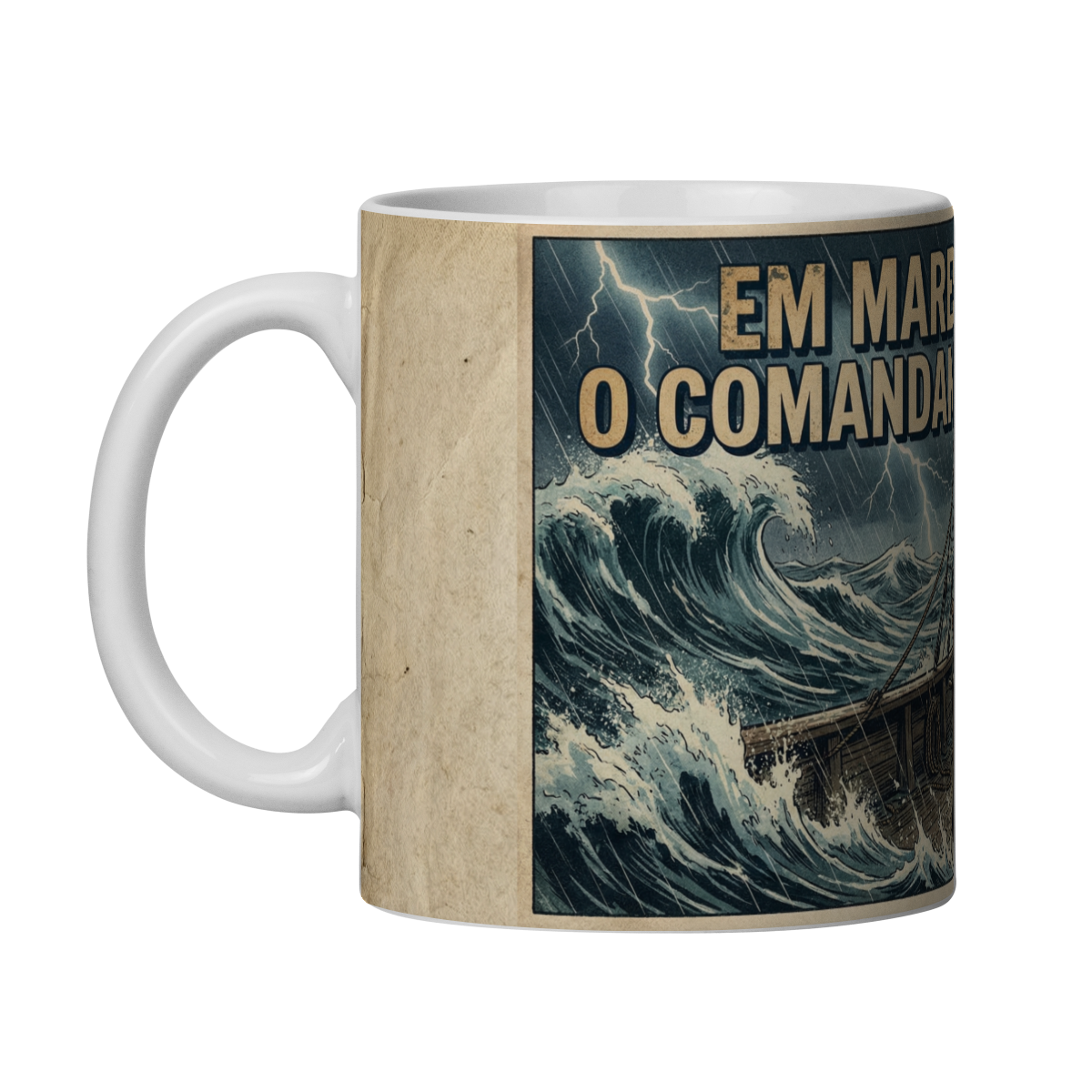 Essa caneca traz uma imagem poderosa de liderança sob pressão. Em estilo HQ vintage, a arte mostra um comandante firme ao leme, enfrentando um mar bravo, relâmpagos cortando o céu e ondas gigantes testando cada decisão. Enquanto a tripulação luta contra o caos, é a postura do líder que mantém o rumo.