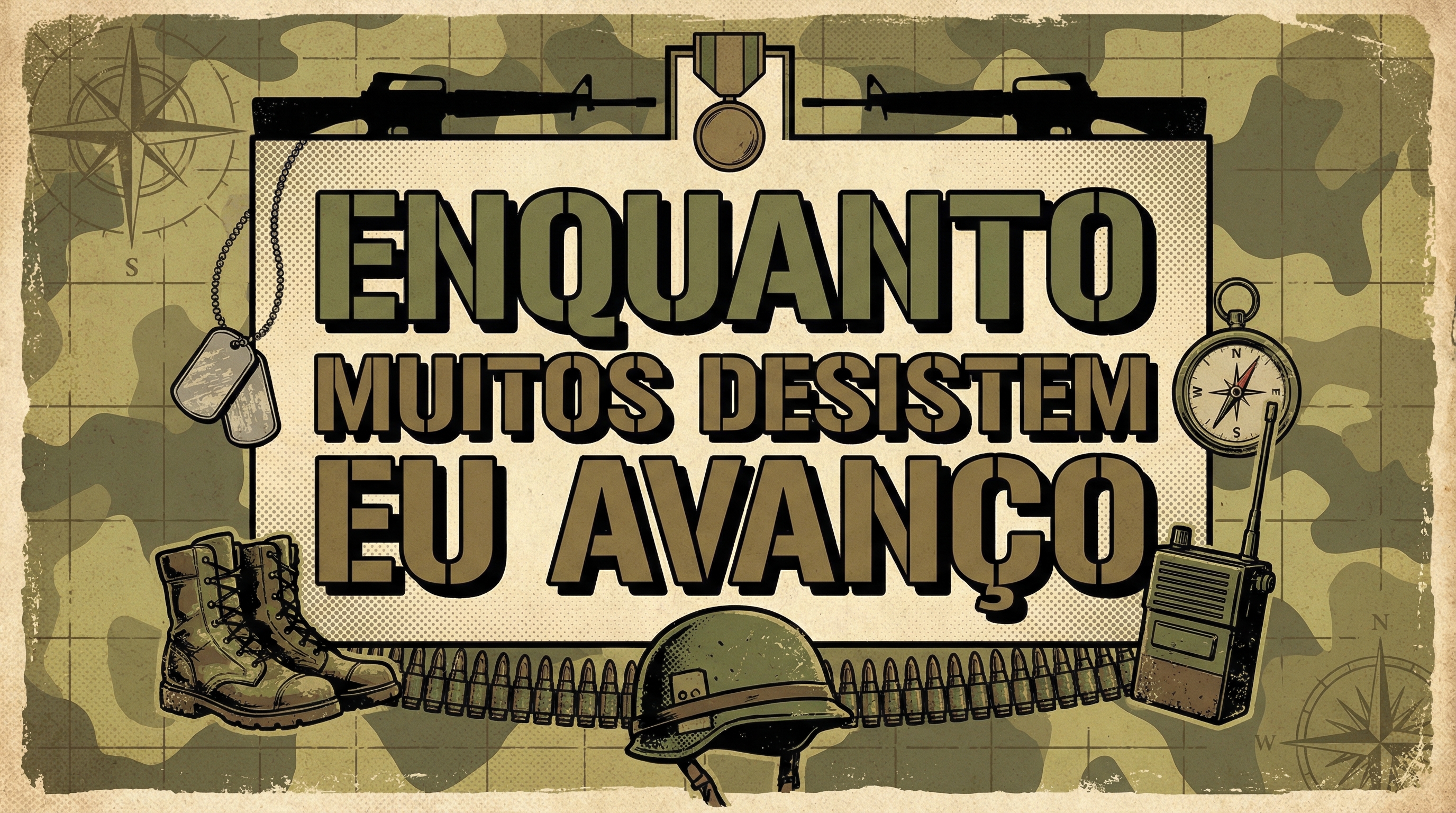 Com arte em estilo HQ retrô dos anos 50–60, inspirada em pôsteres militares clássicos, a estampa reúne elementos simbólicos da rotina operacional — coturno, capacete, rádio, bússola, munição e plaquetas de identificação — reforçando a importância da perseverança, do foco e da disciplina em qualquer missão.