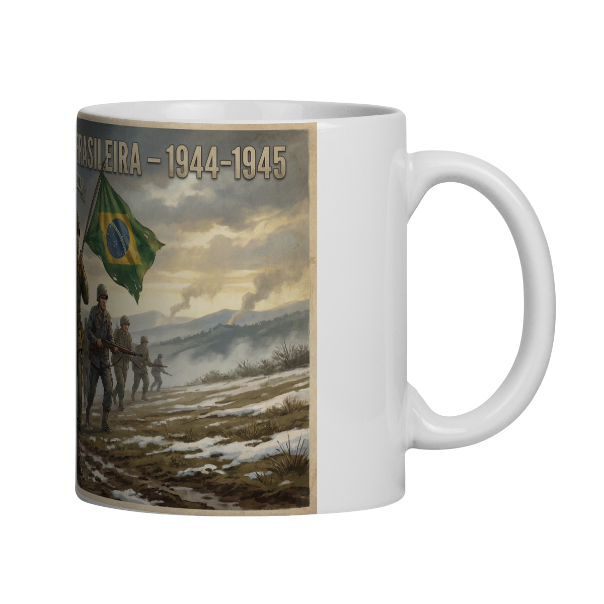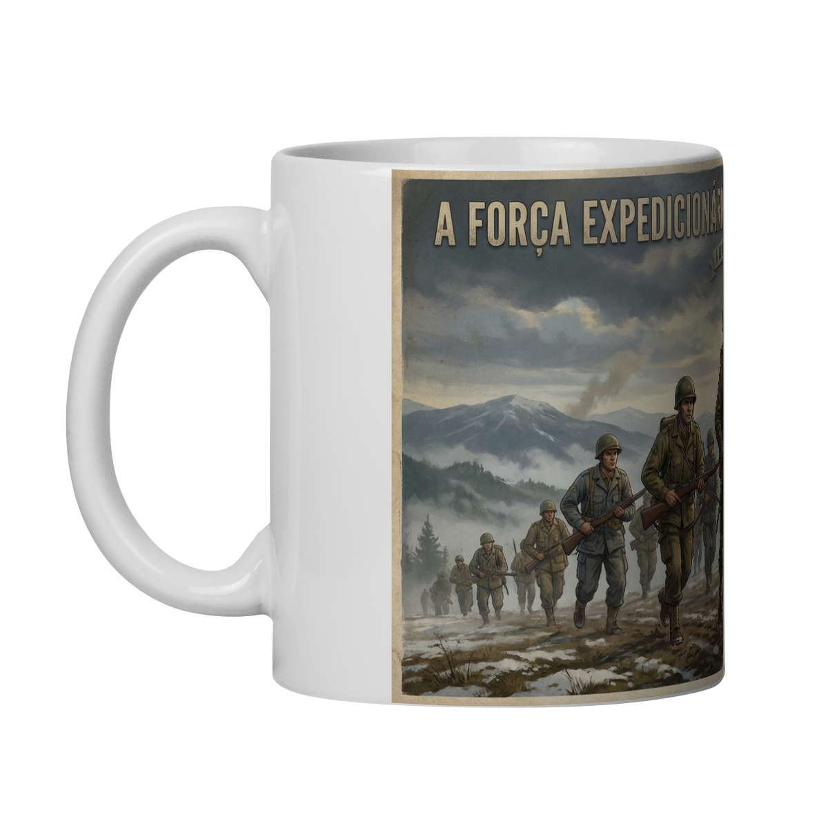 Esta caneca retrata, em estilo artístico histórico e dramático, os soldados da Força Expedicionária Brasileira avançando pela Campanha da Itália sob o frio e a neblina do inverno europeu. Ao centro, a bandeira do Brasil tremula firme, simbolizando coragem, sacrifício e patriotismo.