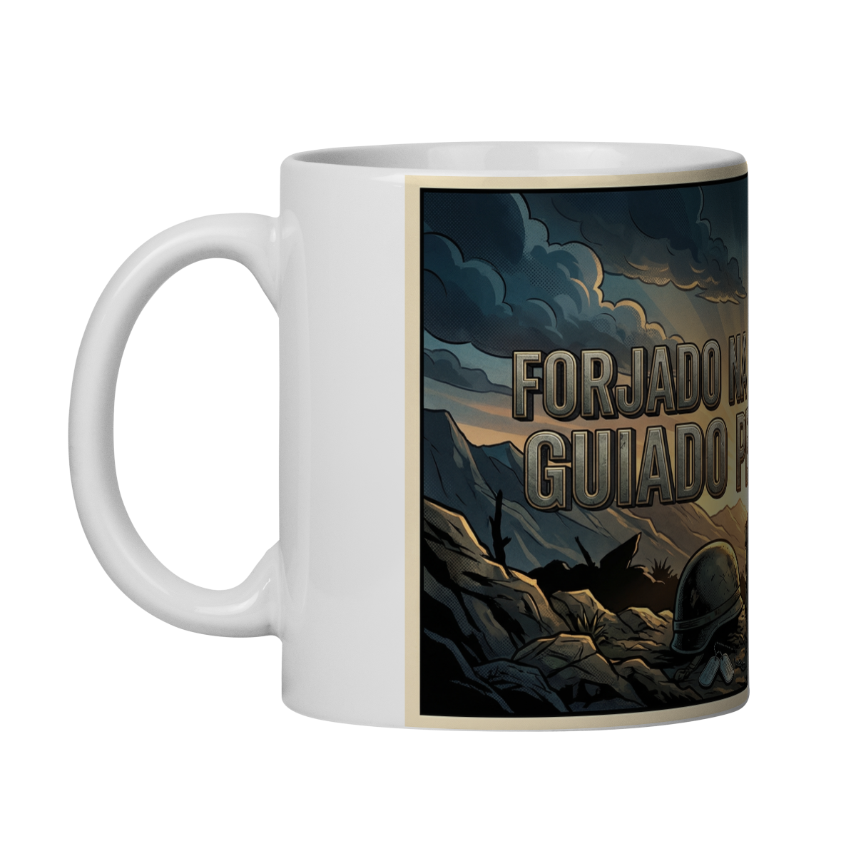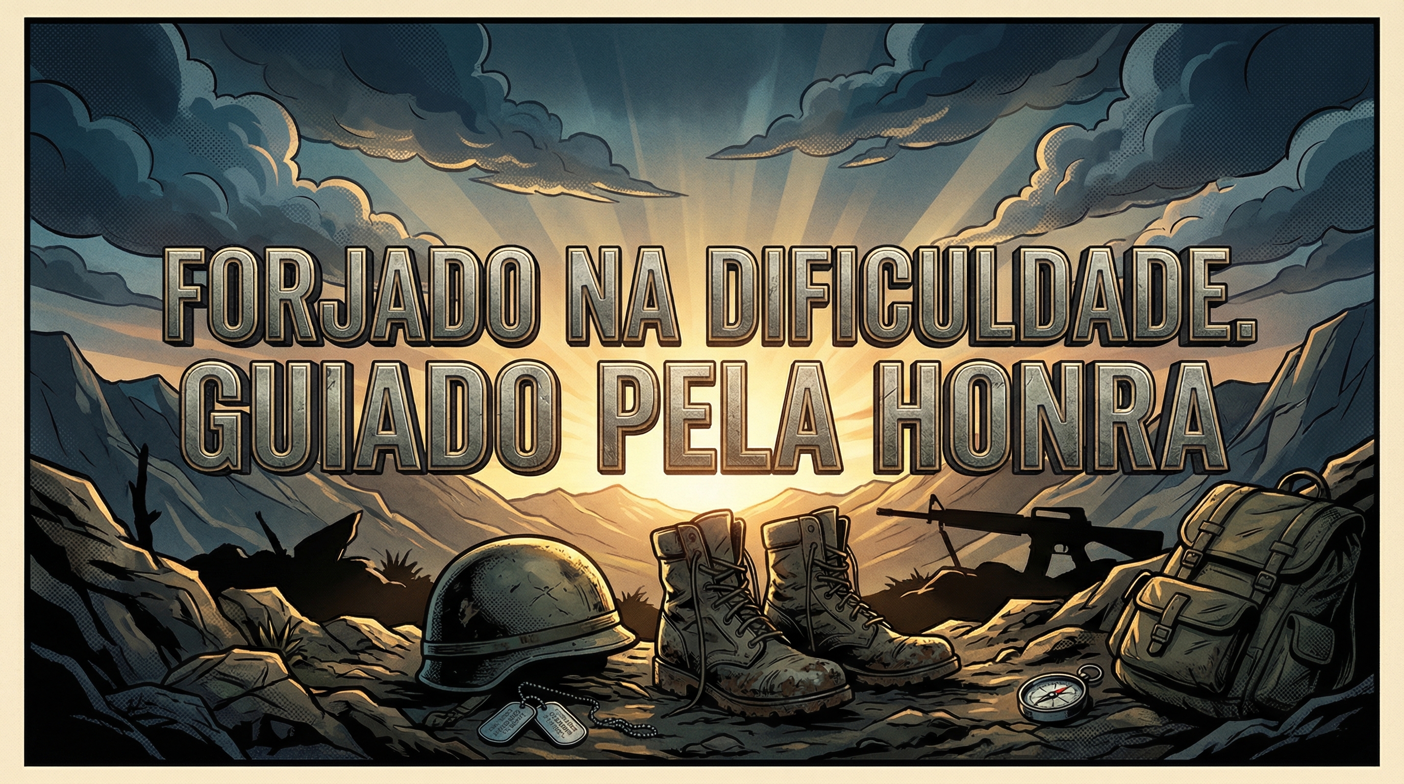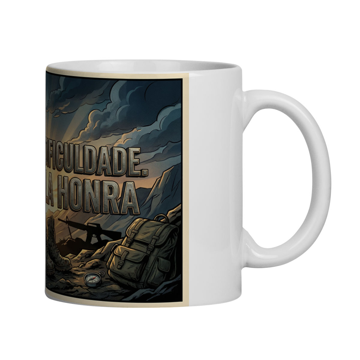 A caneca “Forjado na Dificuldade. Guiado pela Honra” representa a jornada de quem enfrentou desafios, superou limites e construiu caráter através da disciplina e do compromisso.