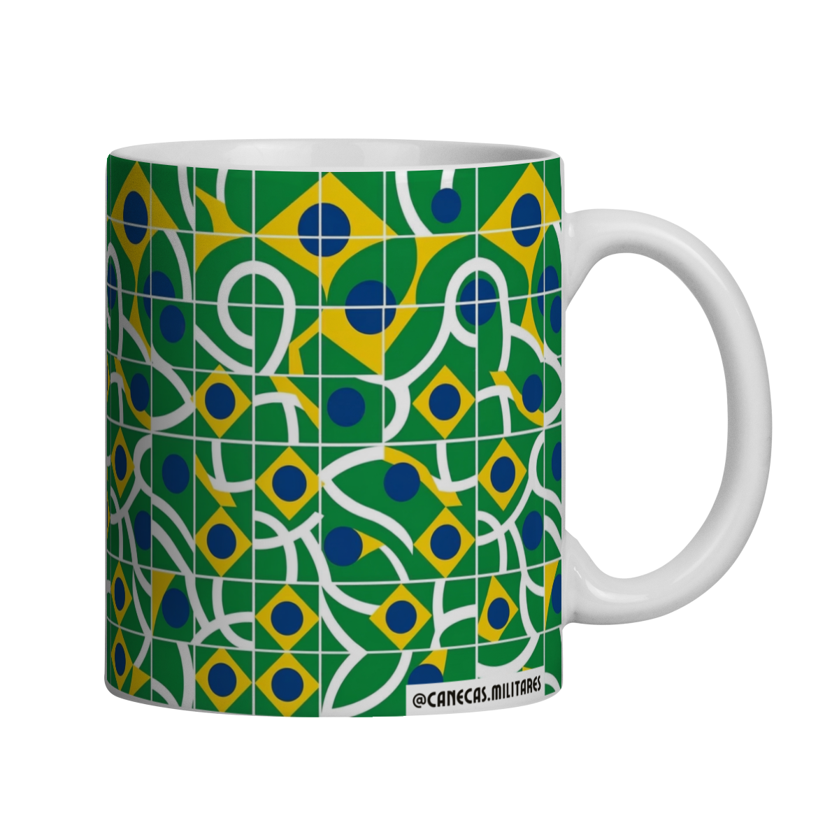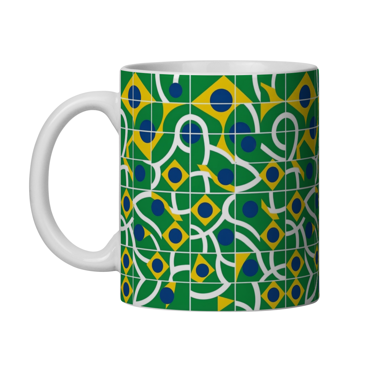A caneca apresenta uma arte inspirada na estética do modernismo brasileiro, combinando elementos da bandeira do Brasil em um padrão geométrico repetitivo que lembra painéis de azulejos arquitetônicos.