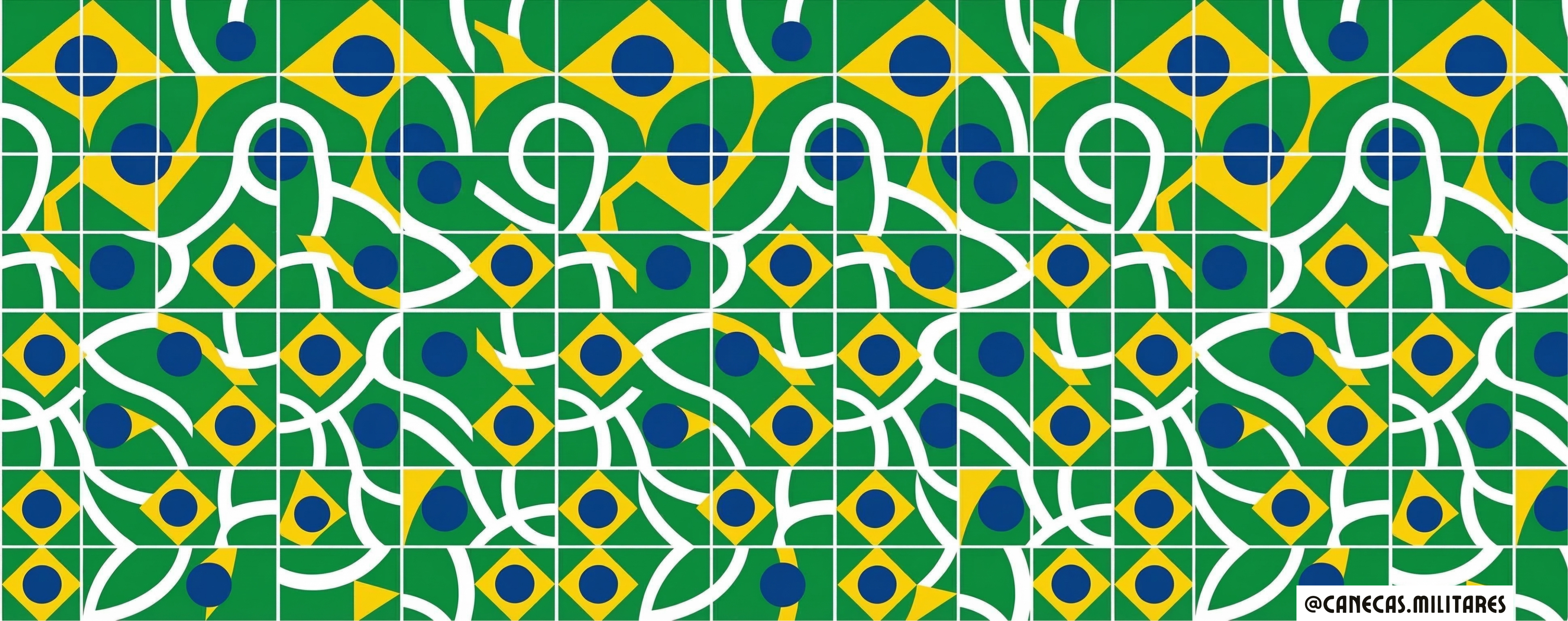 A composição é formada por losangos amarelos, círculos azuis e curvas brancas sobre fundo verde, organizados em uma grade de quadrados que cria a sensação de um grande mural modular. O resultado é uma arte vibrante, equilibrada e visualmente marcante, com cores chapadas e linhas nítidas que destacam a identidade visual brasileira de forma contemporânea.