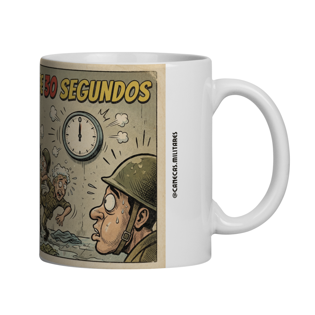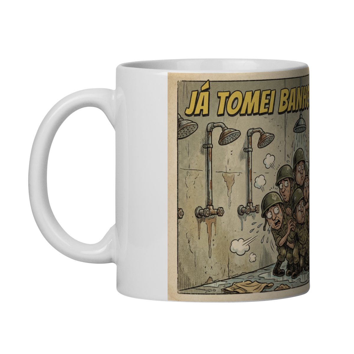 Essa caneca retrata um dos momentos mais democráticos da vida militar: o banho coletivo onde a água acaba antes da dignidade. É gente entrando seco, saindo com shampoo e sem explicação - tudo em tempo recorde.