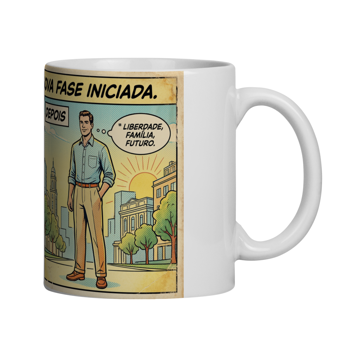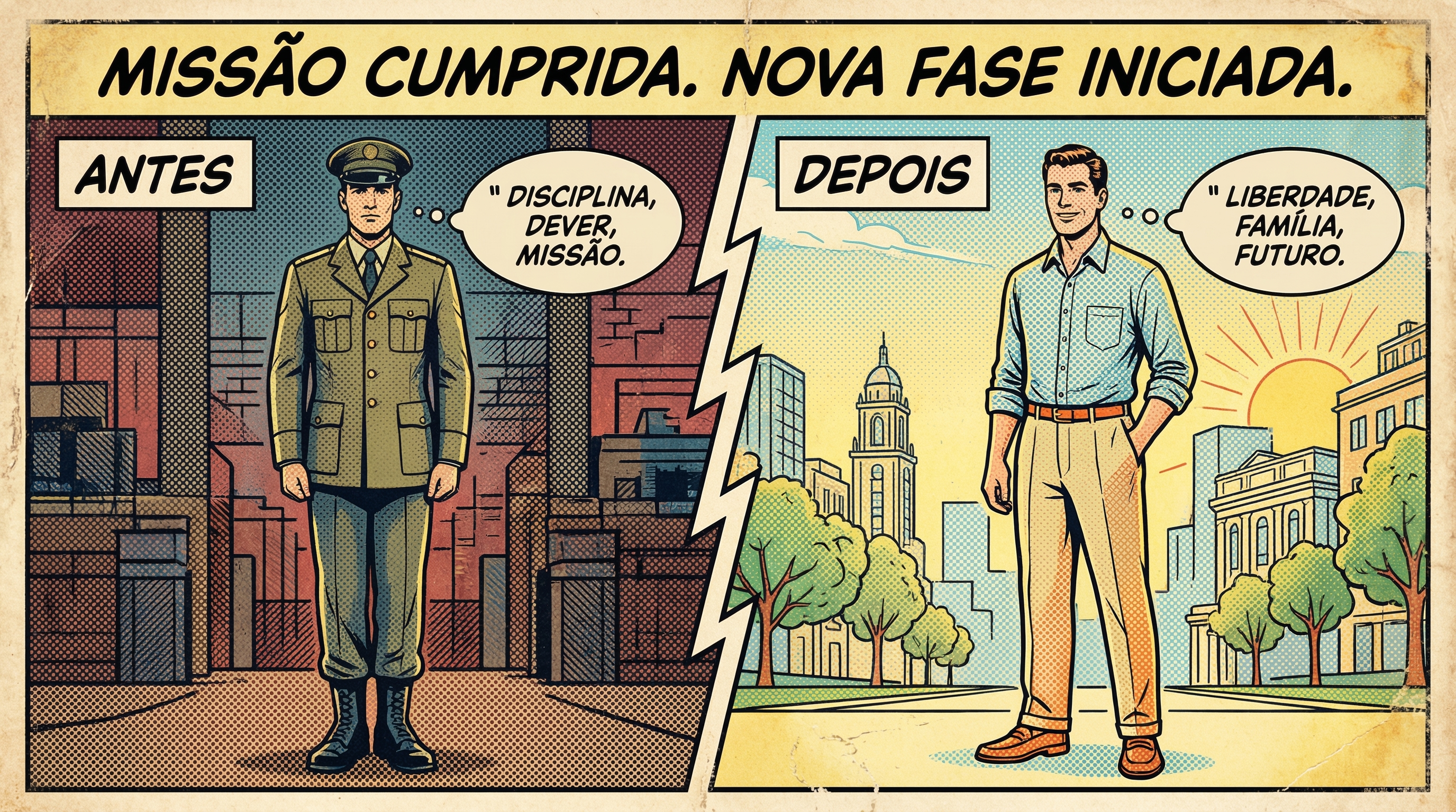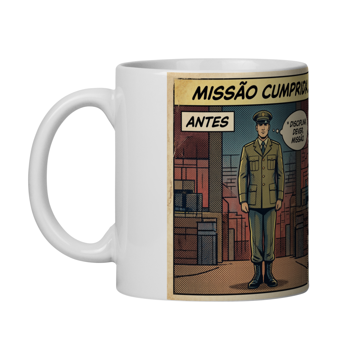 A caneca “Missão cumprida. Nova fase iniciada.” simboliza a transição do militar para a vida civil, valorizando continuidade, identidade e propósito. A arte, inspirada no estilo HQ clássico dos anos 50–60, representa o mesmo indivíduo em dois momentos da vida - mostrando que a farda sai, mas os valores permanecem.
