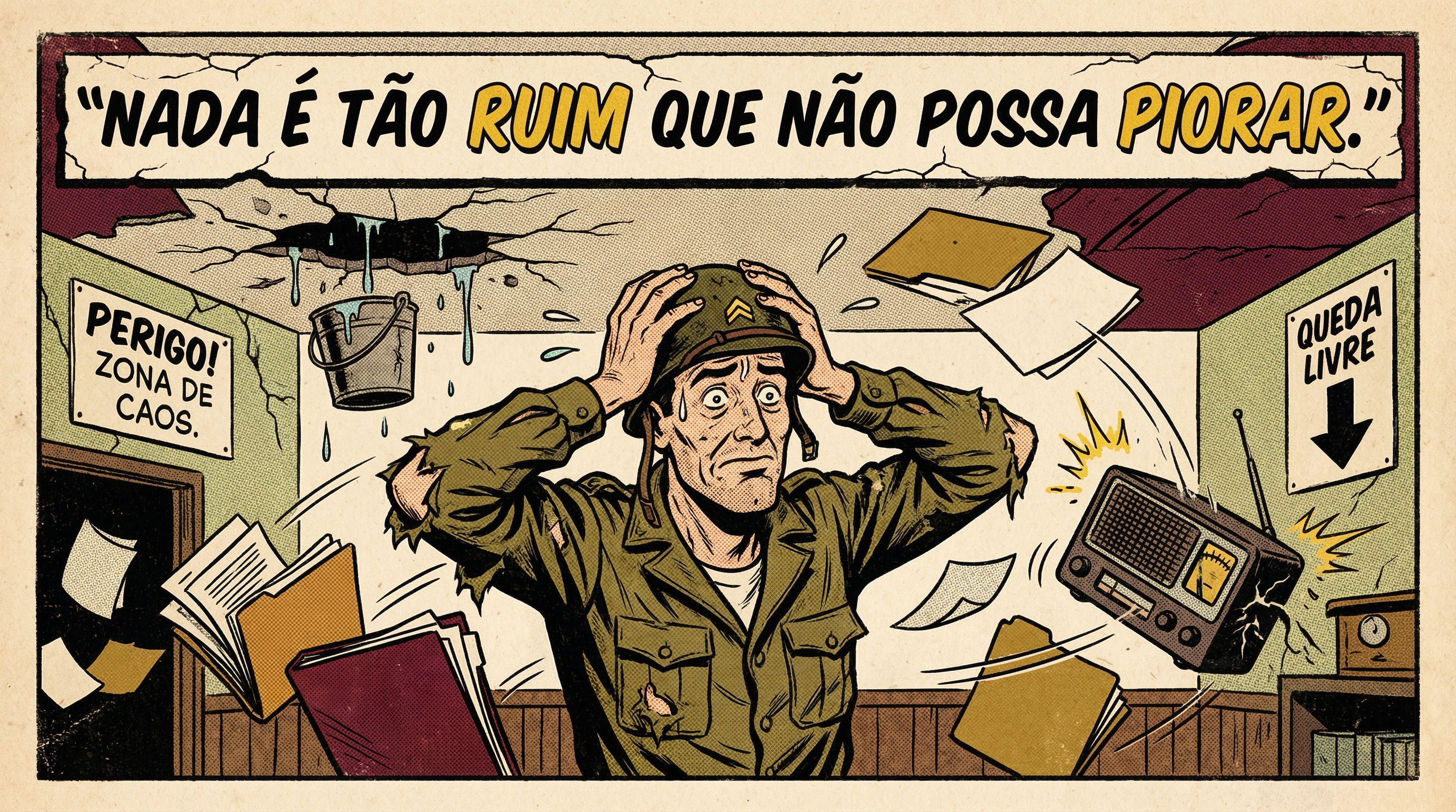 A frase “Nada é tão ruim que não possa piorar” é um clássico do humor de quartel — aquele riso seco de quem já aprendeu que, mesmo quando tudo parece no limite, sempre dá para testar a resiliência mais uma vez.