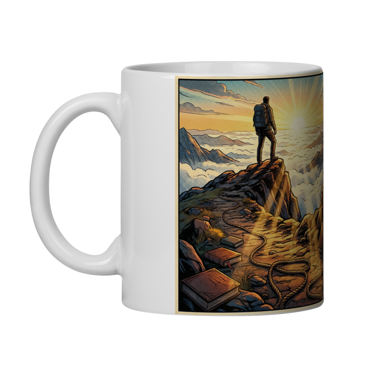 Com arte épica em estilo ilustrado cinematográfico, a estampa mostra uma pessoa no topo de uma montanha ao nascer do sol, cercada por símbolos de aprendizado e dedicação — livros, bússola, corda e relógio — refletindo planejamento, persistência e compromisso com a própria evolução.