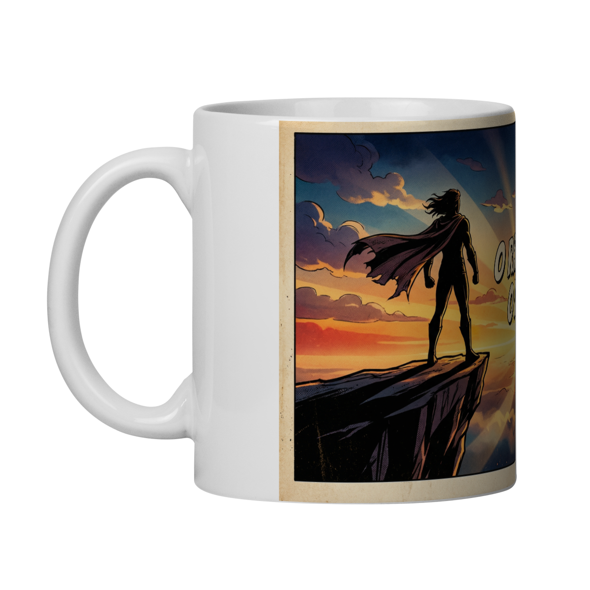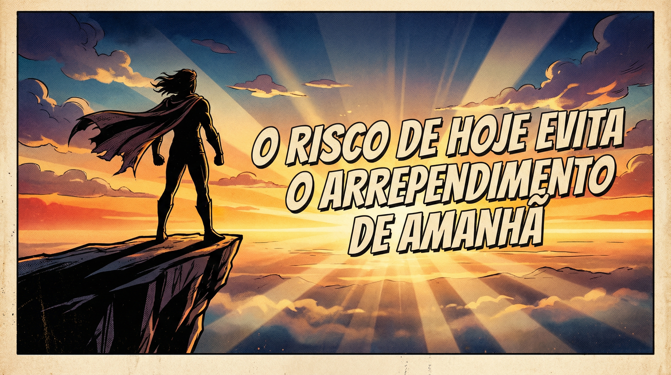 Com arte em estilo HQ épico anos 50–60, a ilustração retrata a silhueta de uma figura firme no alto de um penhasco, encarando o horizonte ao nascer do sol — símbolo de coragem, decisão e visão de futuro.