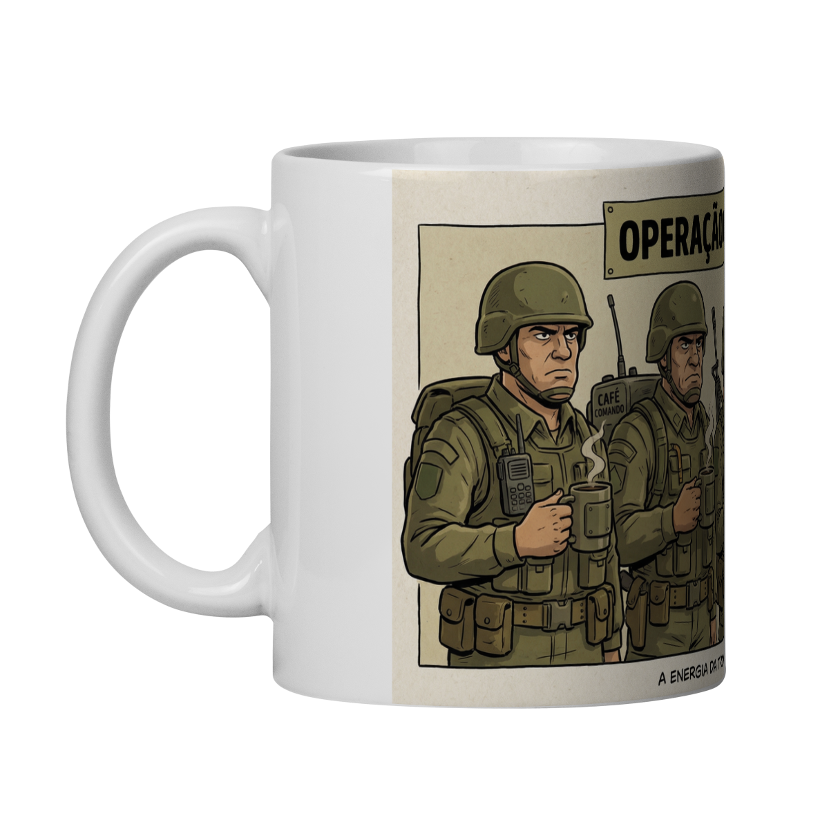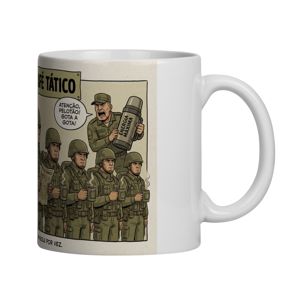 — a caneca celebra o verdadeiro combustível da rotina militar: o café forte.