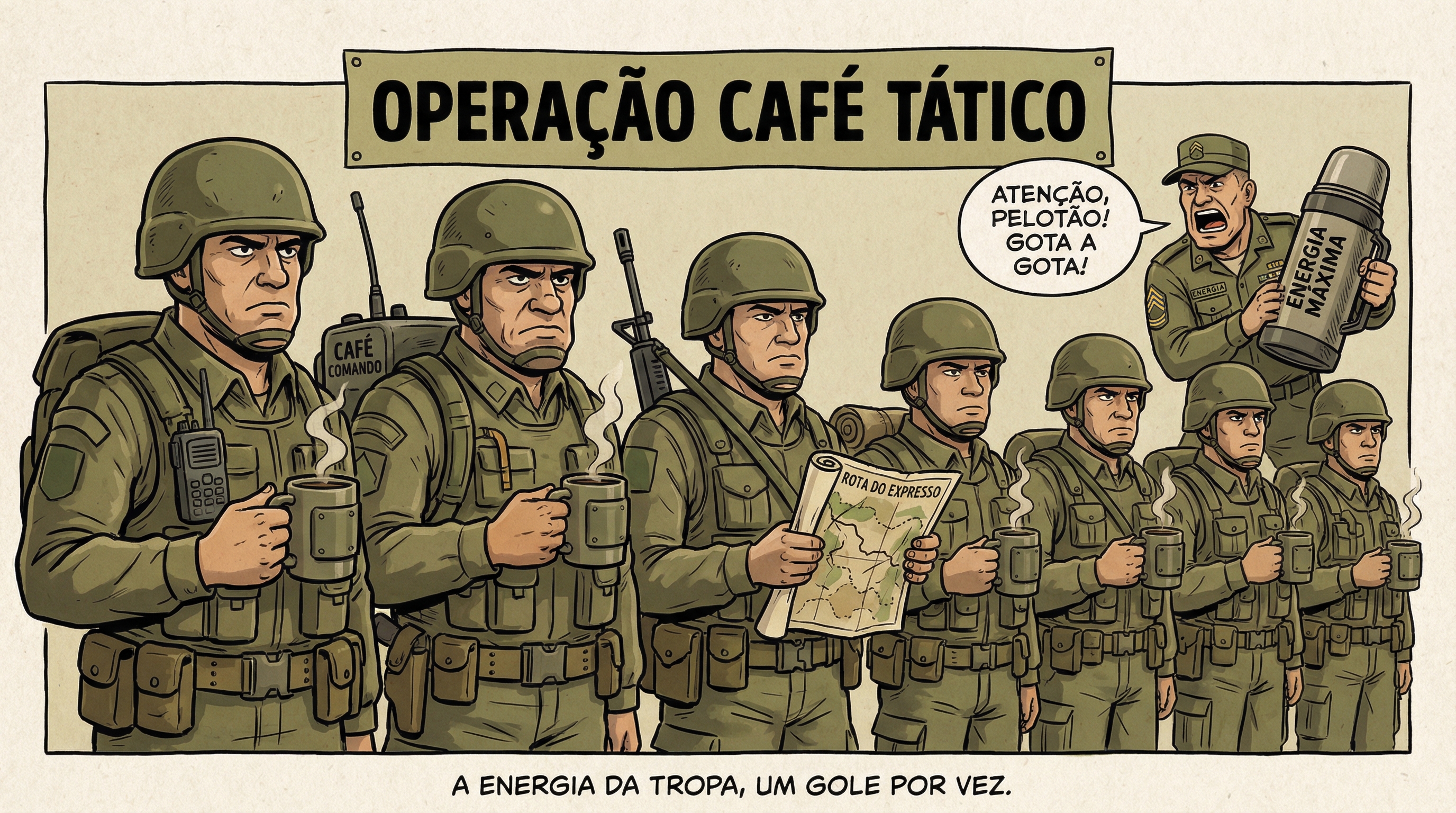 Nesta arte estilo HQ militar, a tropa está pronta para a missão mais estratégica do dia: a recarga oficial de energia. Em formação impecável, cada combatente segura sua caneca como se fosse equipamento essencial de combate.