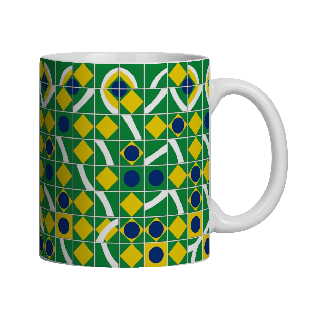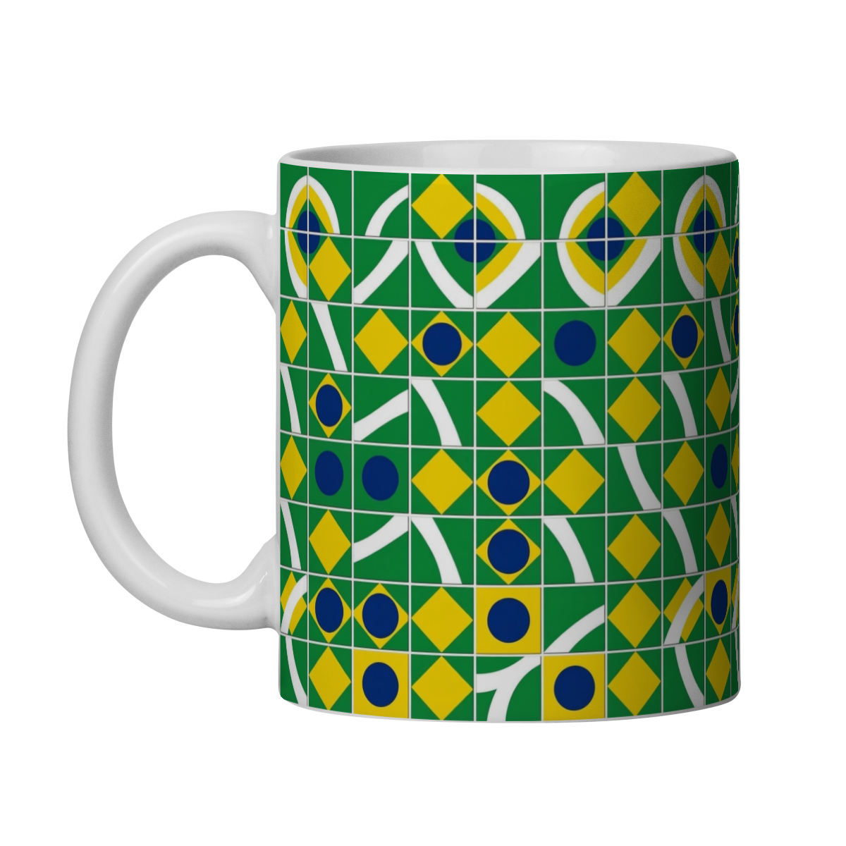A caneca apresenta uma arte geométrica inspirada nos elementos da bandeira do Brasil, reinterpretados em um padrão modular que lembra painéis de azulejos modernistas. O design combina losangos amarelos, círculos azuis e curvas brancas sobre fundo verde, organizados em uma grade de quadrados que cria a sensação de um grande mosaico contínuo.