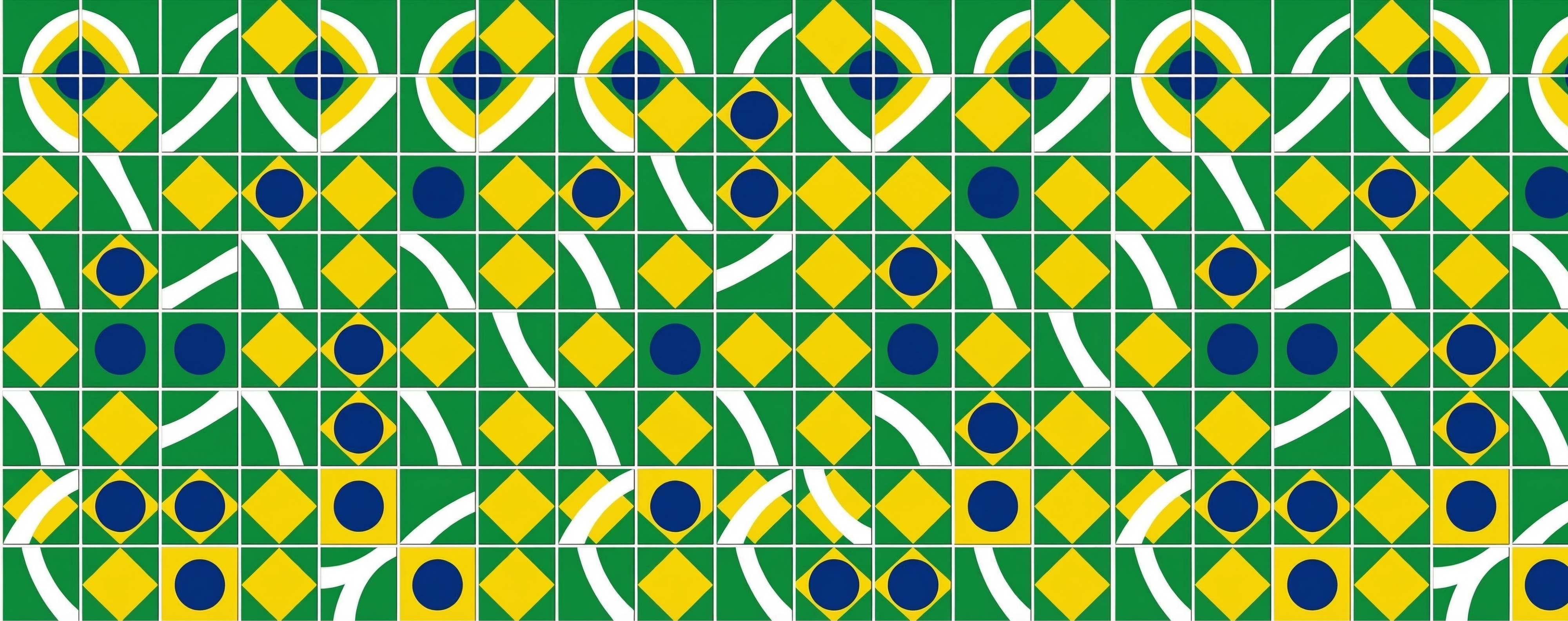 Cada módulo funciona como uma pequena peça de azulejo que, ao se repetir, forma uma composição dinâmica e equilibrada. As formas simples e as cores chapadas criam um visual limpo, contemporâneo e ao mesmo tempo profundamente ligado à identidade visual brasileira.
