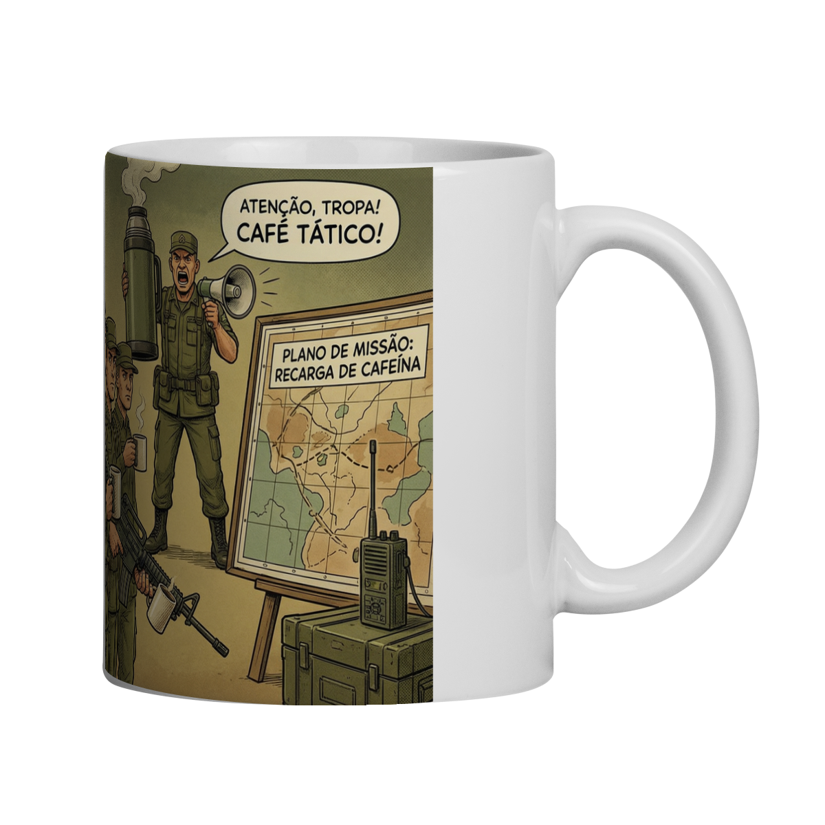 Esta caneca traz o espírito irreverente da tropa que sabe que nenhuma operação começa sem o verdadeiro combustível da missão: o café.