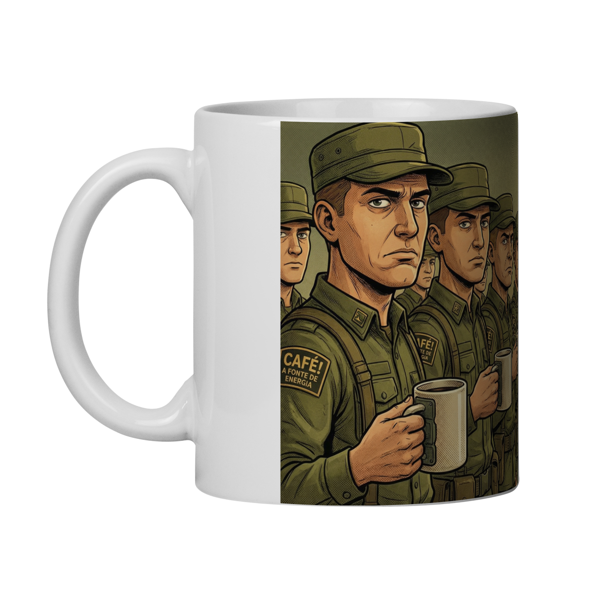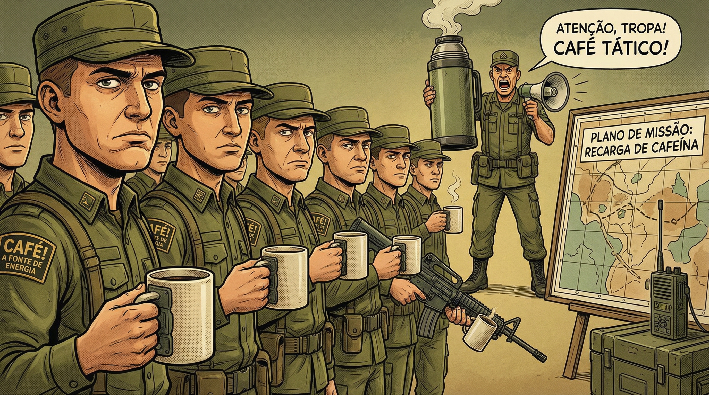 Enquanto o pelotão, em perfeita disciplina, segura sua caneca como se fosse equipamento essencial de combate.