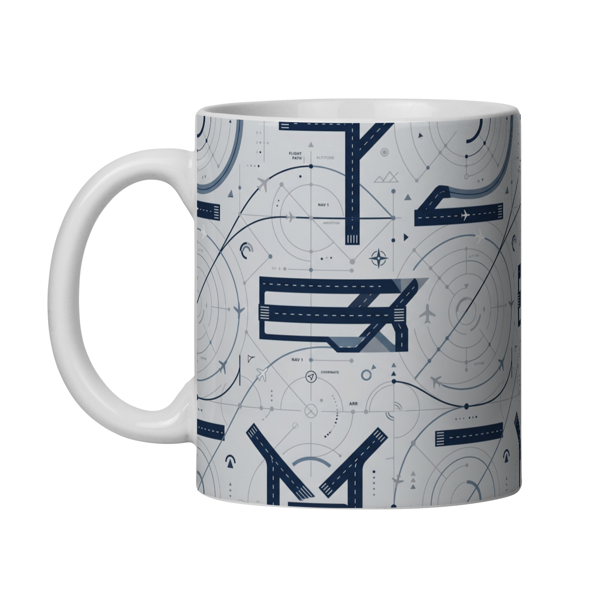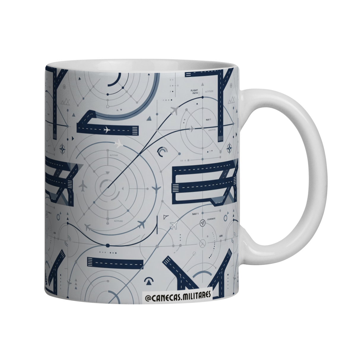 Essa caneca transforma a lógica da aviação em um design moderno, preciso e visualmente envolvente. Inspirada em pistas, sistemas de navegação e fluxos de voo, a composição cria um padrão dinâmico que remete à organização e ao movimento do espaço aéreo.
