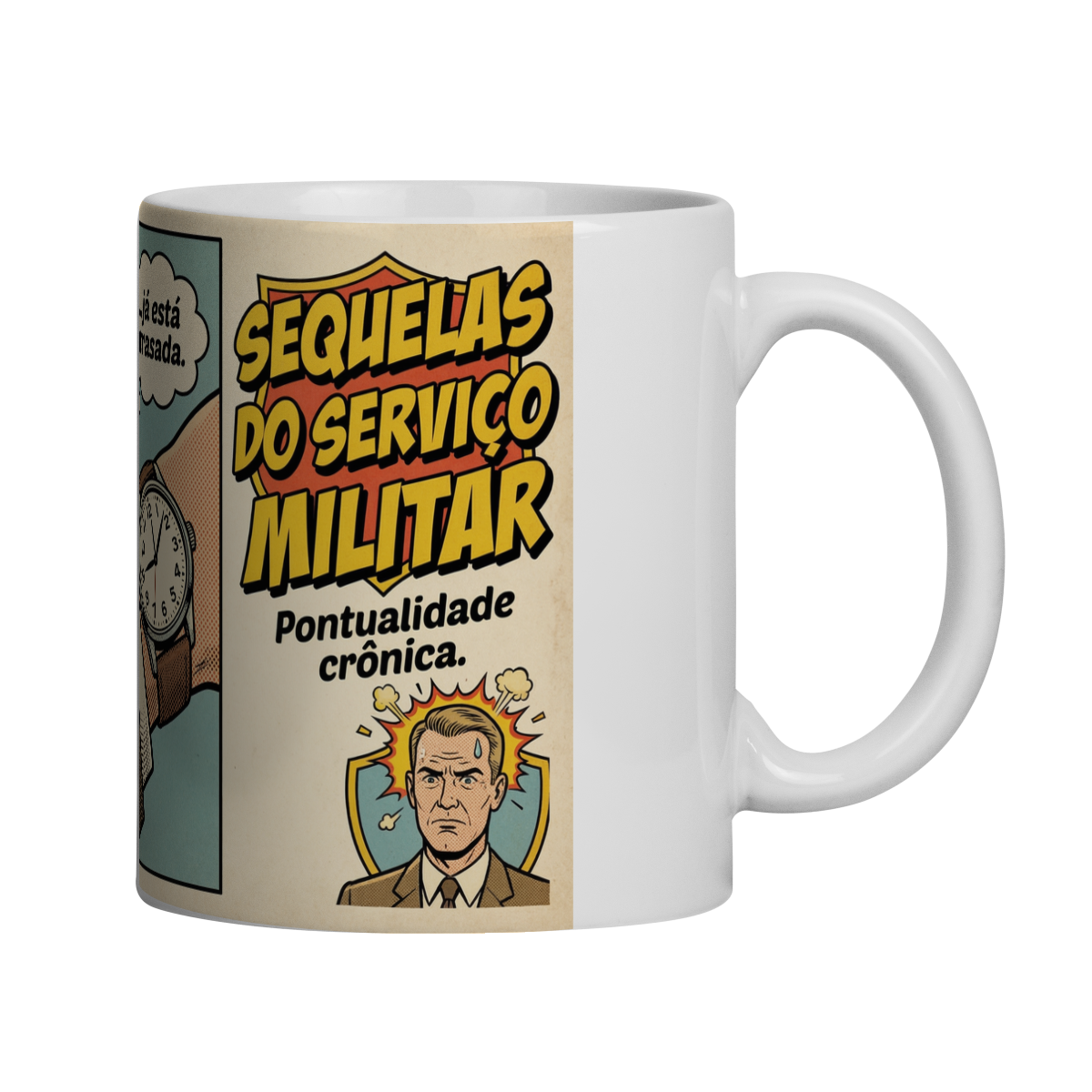 A caneca “Sequelas do Serviço Militar – Pontualidade Crônica” traz, com bom humor, uma daquelas marcas positivas que muitos veteranos carregam: o respeito absoluto ao tempo.
