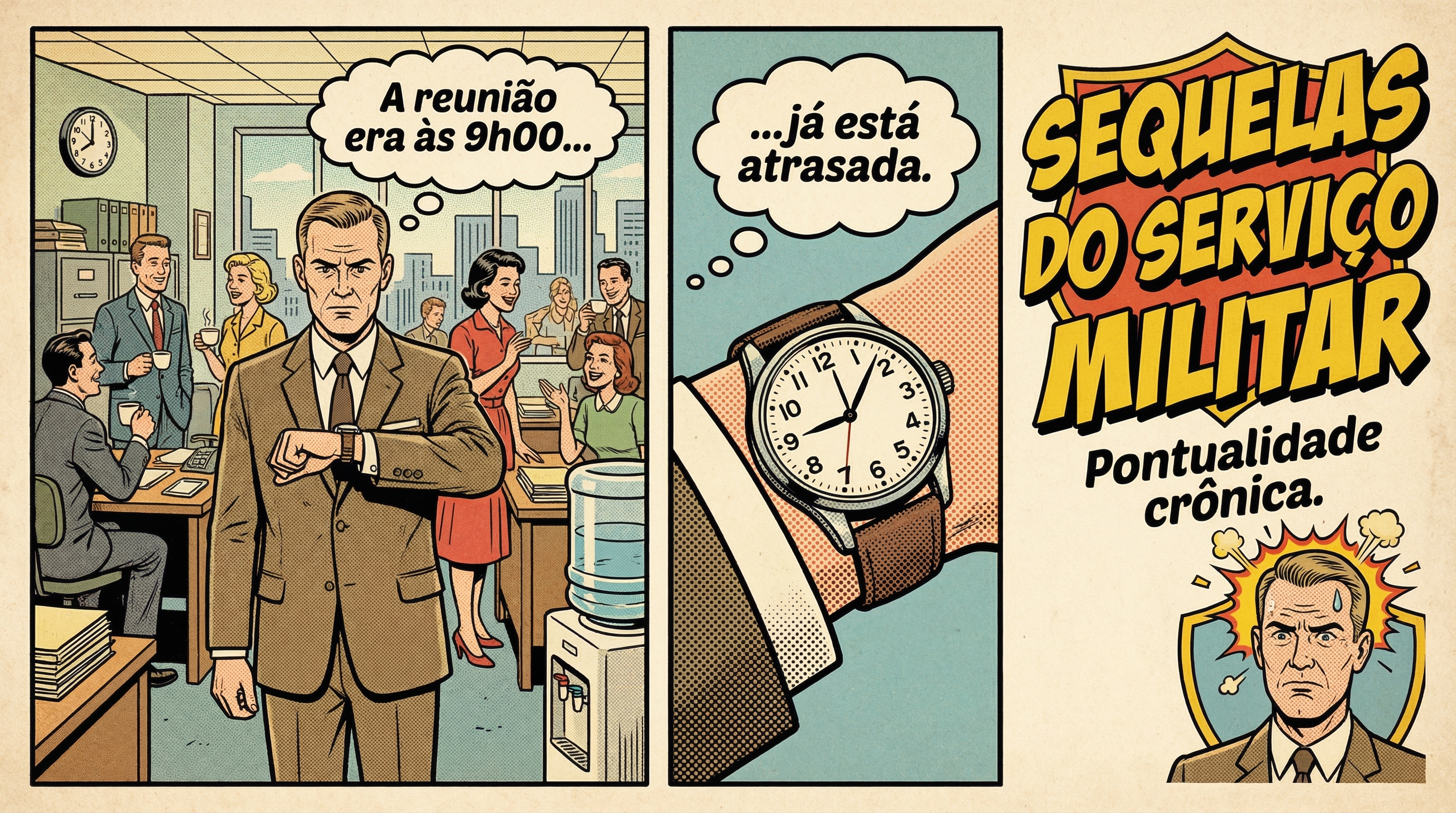 Inspirada no estilo HQ clássico dos anos 50–60, a arte transforma a pontualidade em motivo de orgulho - e de identificação - para quem serviu e para quem convive com quem serviu.
