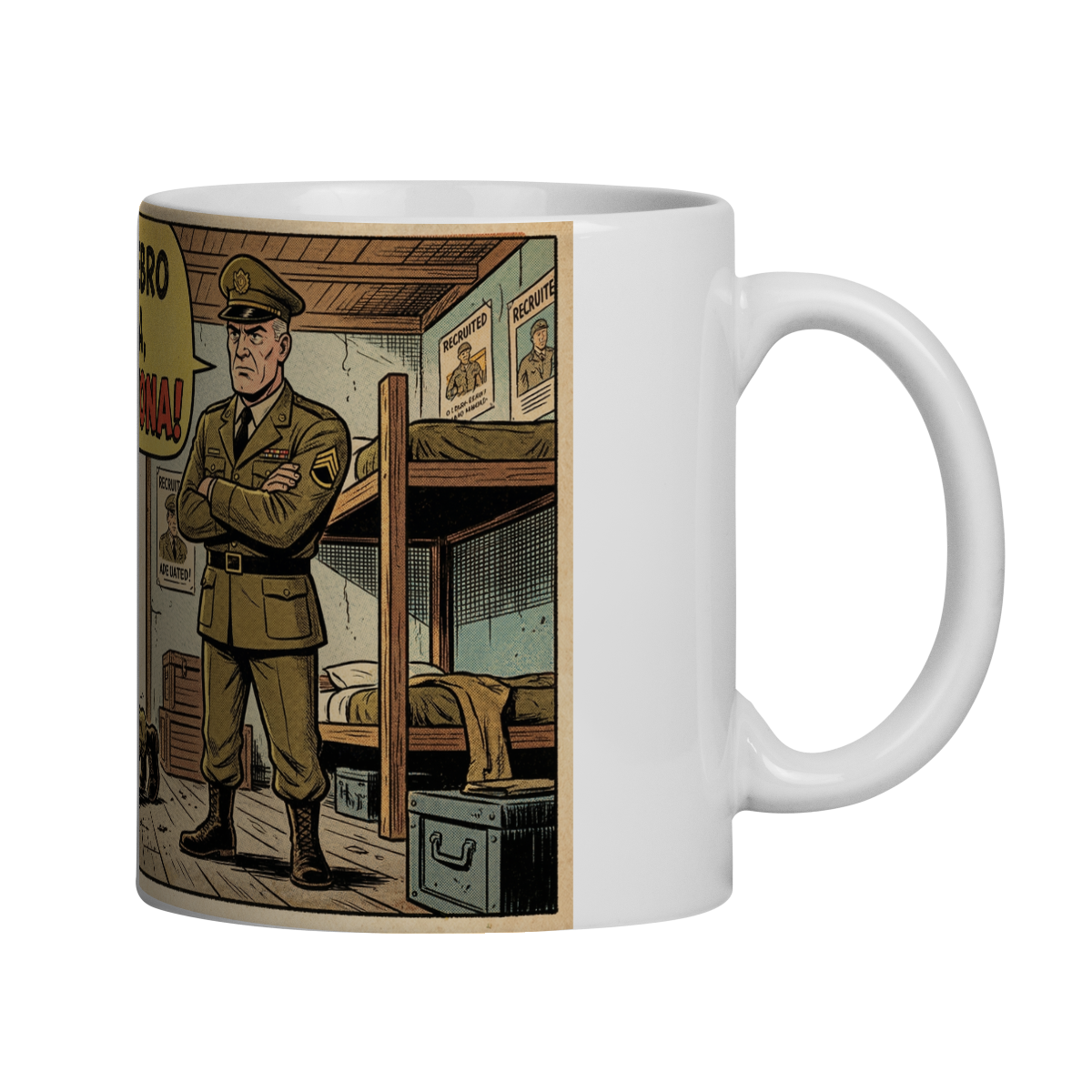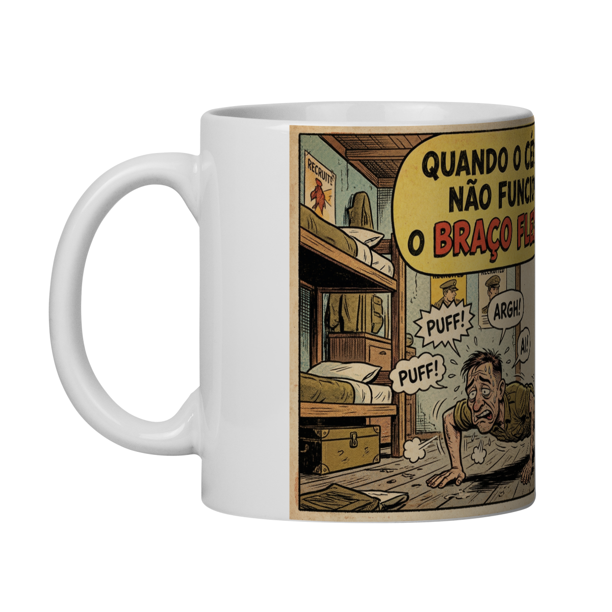 Com arte exclusiva em estilo HQ retrô (anos 50–60), esta caneca transforma uma lembrança comum da vida militar em risada diária, perfeita para acompanhar o café de quem já fez flexão por muito menos.