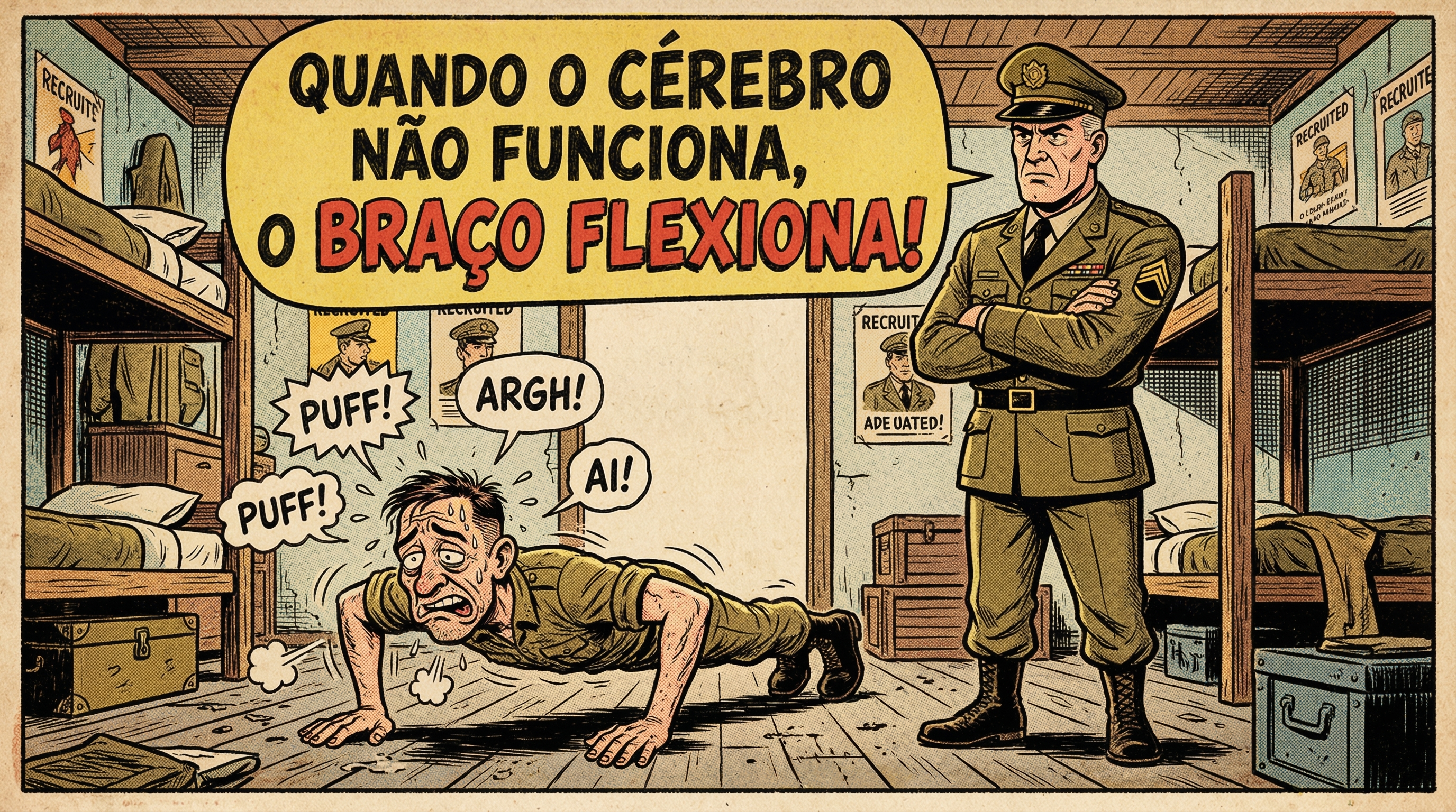 A frase “Quando o cérebro não funciona, o braço flexiona!” é um clássico do humor militar - direta, irônica e impossível de esquecer. Ela resume, com bom humor, aquela pedagogia peculiar da instrução militar, onde a disciplina entra primeiro pelo esforço e só depois pela cabeça.