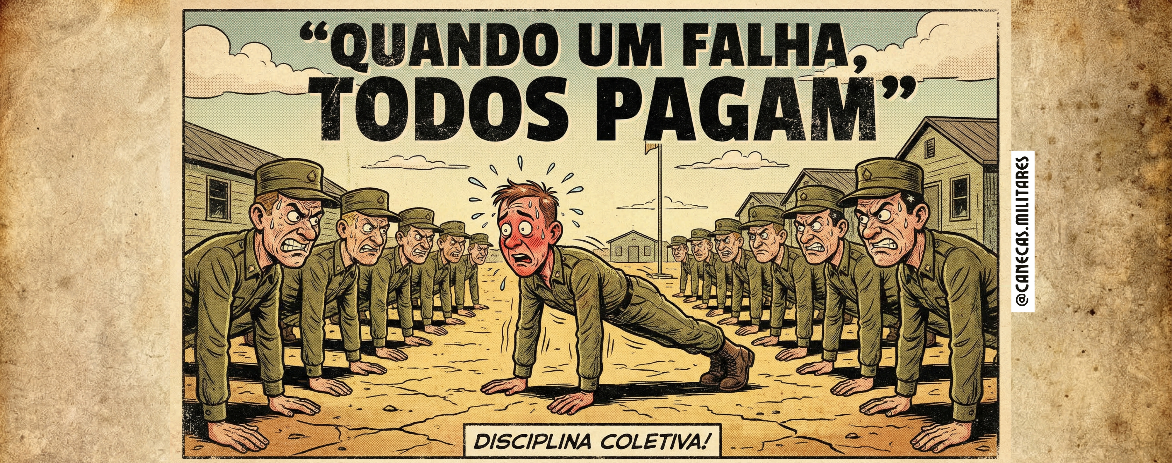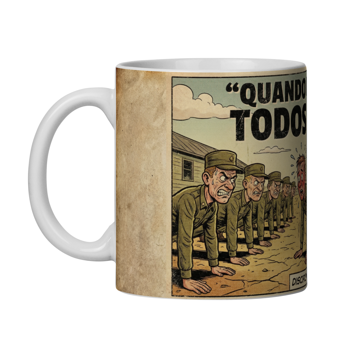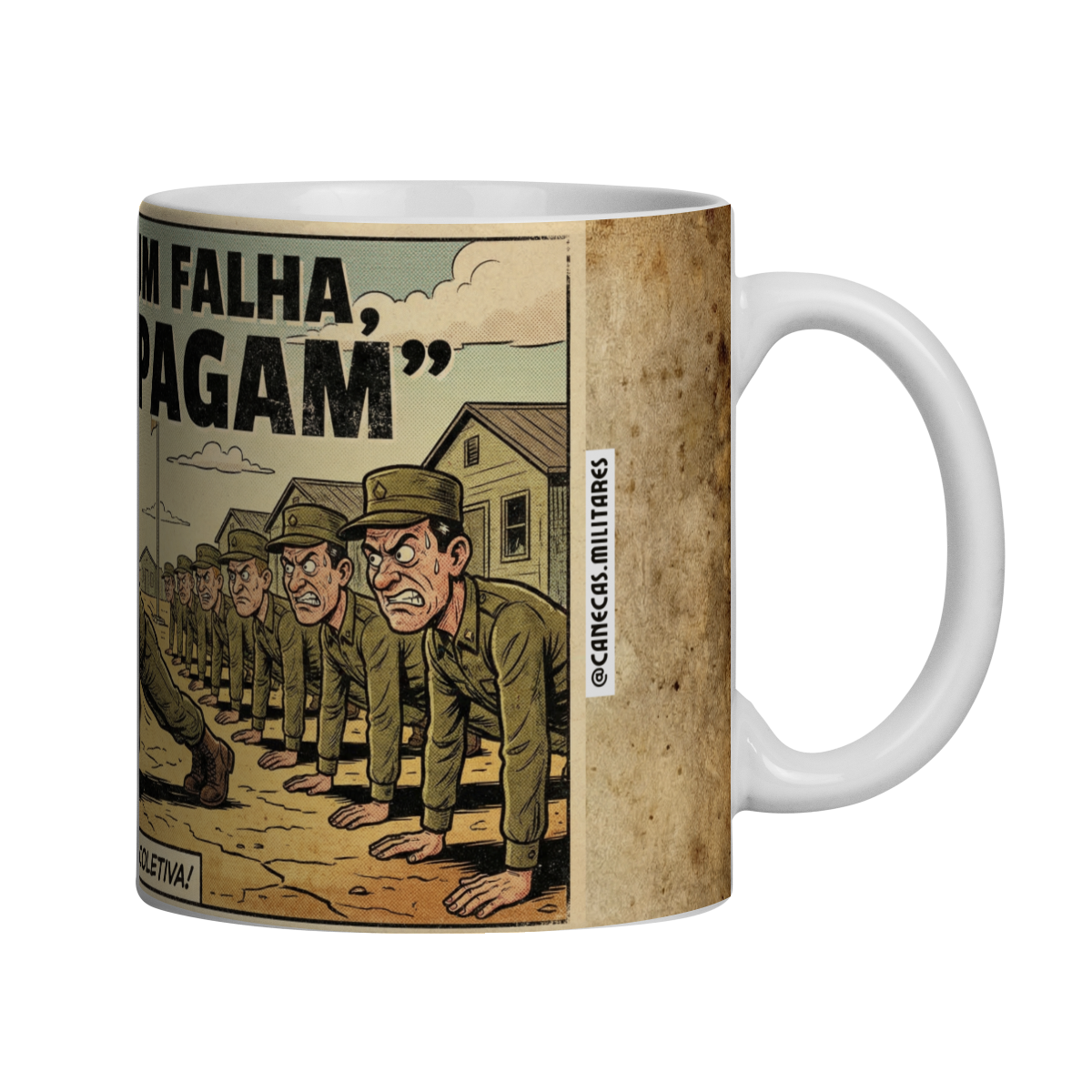 Essa caneca traz uma cena clássica da vida militar retratada com humor inteligente no estilo HQ vintage. A ilustração mostra um pelotão inteiro pagando flexão, todos com olhar de poucos amigos, enquanto o “responsável” encara o peso da culpa com o rosto vermelho de vergonha. Uma imagem que mistura disciplina, coletividade e aquela pitada de ironia que só quem viveu entende.