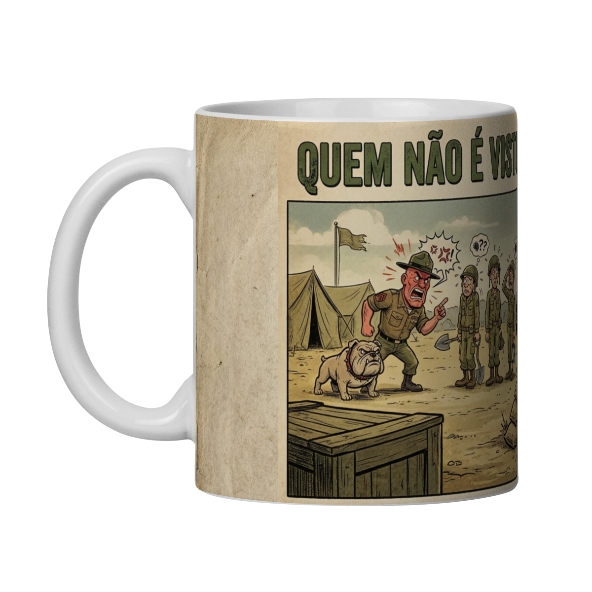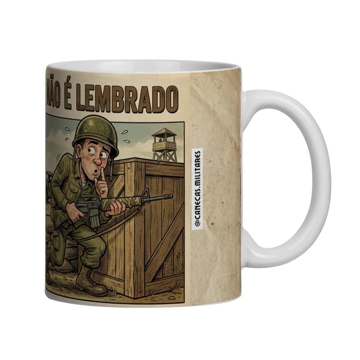 Com traços marcantes, estética retrô e uma narrativa visual clara, essa caneca é ideal para quem viveu o ambiente militar ou para quem entende que, na vida, saber quando aparecer e quando não aparecer também é uma forma de inteligência. Um produto com personalidade, história e conversa embutida.