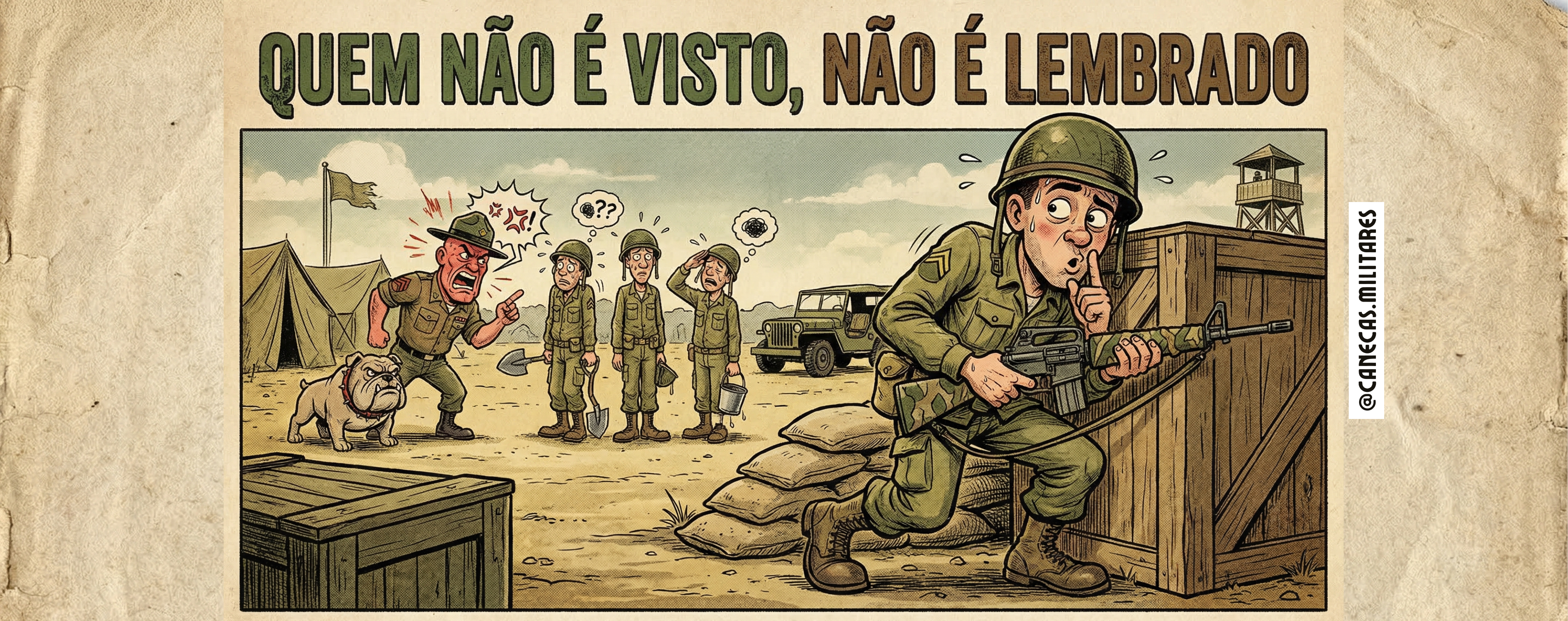 A frase “QUEM NÃO É VISTO, NÃO É LEMBRADO” carrega um duplo sentido poderoso: dentro da caserna, revela a lógica prática do dia a dia; fora dela, provoca reflexão sobre posicionamento, presença e reconhecimento. É humor, mas também é estratégia.