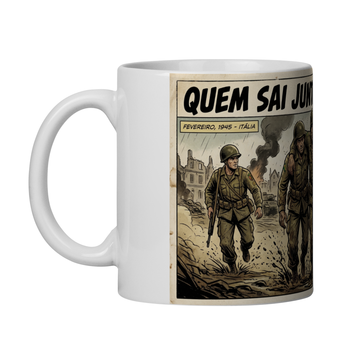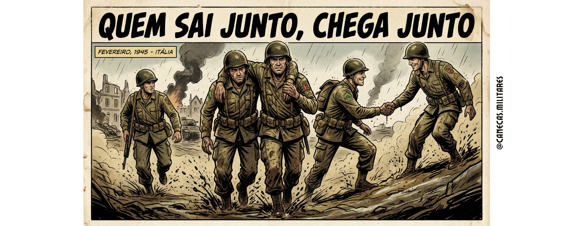 Os traços retrô, o cenário de combate e os detalhes que remetem à Força Expedicionária Brasileira reforçam a ideia de união, lealdade e compromisso até o fim.