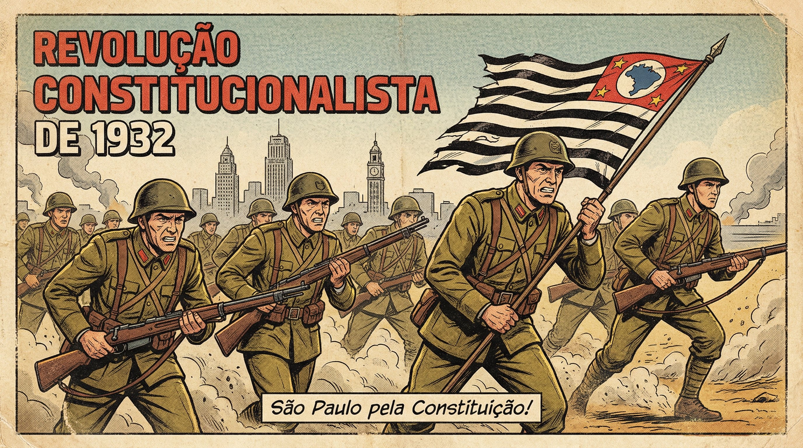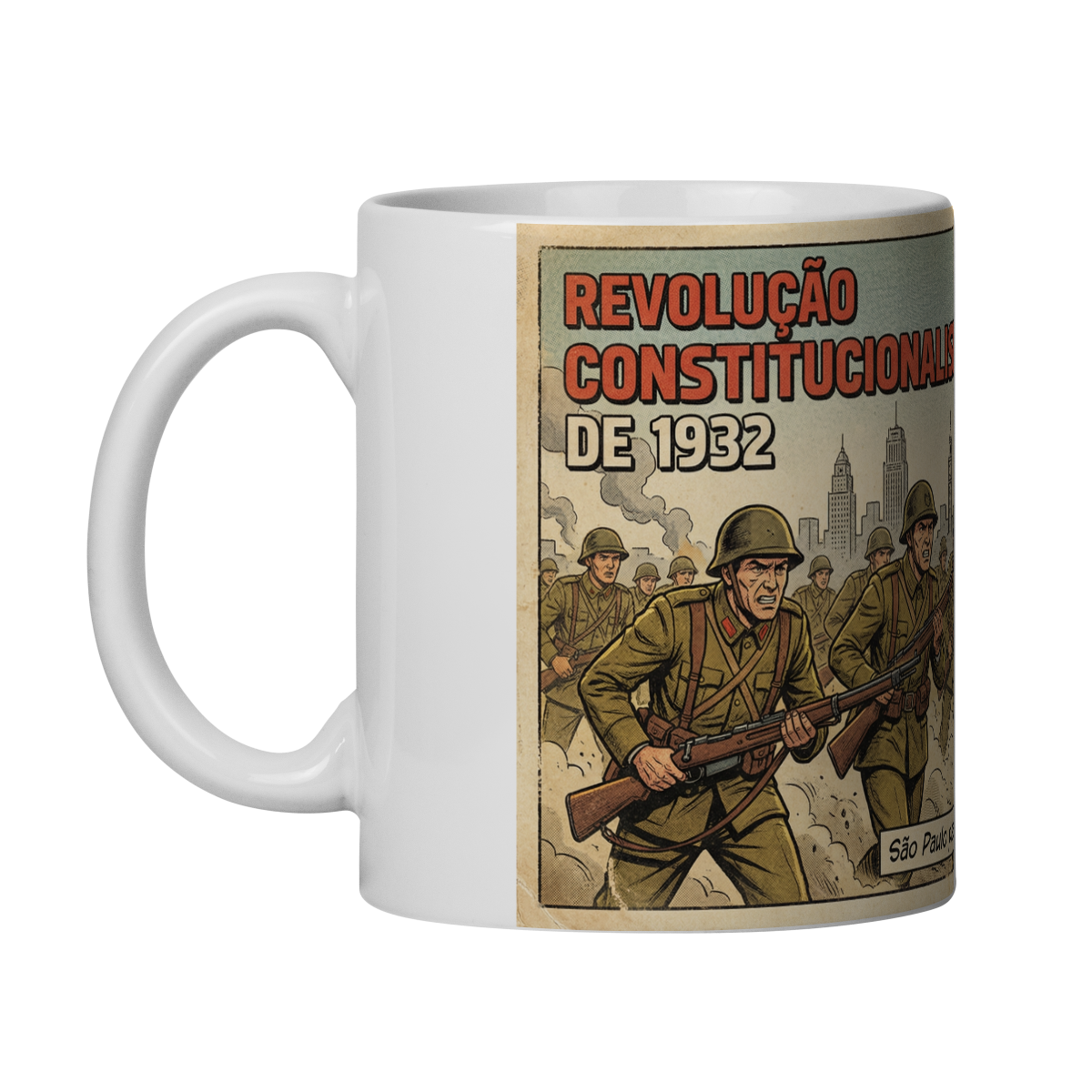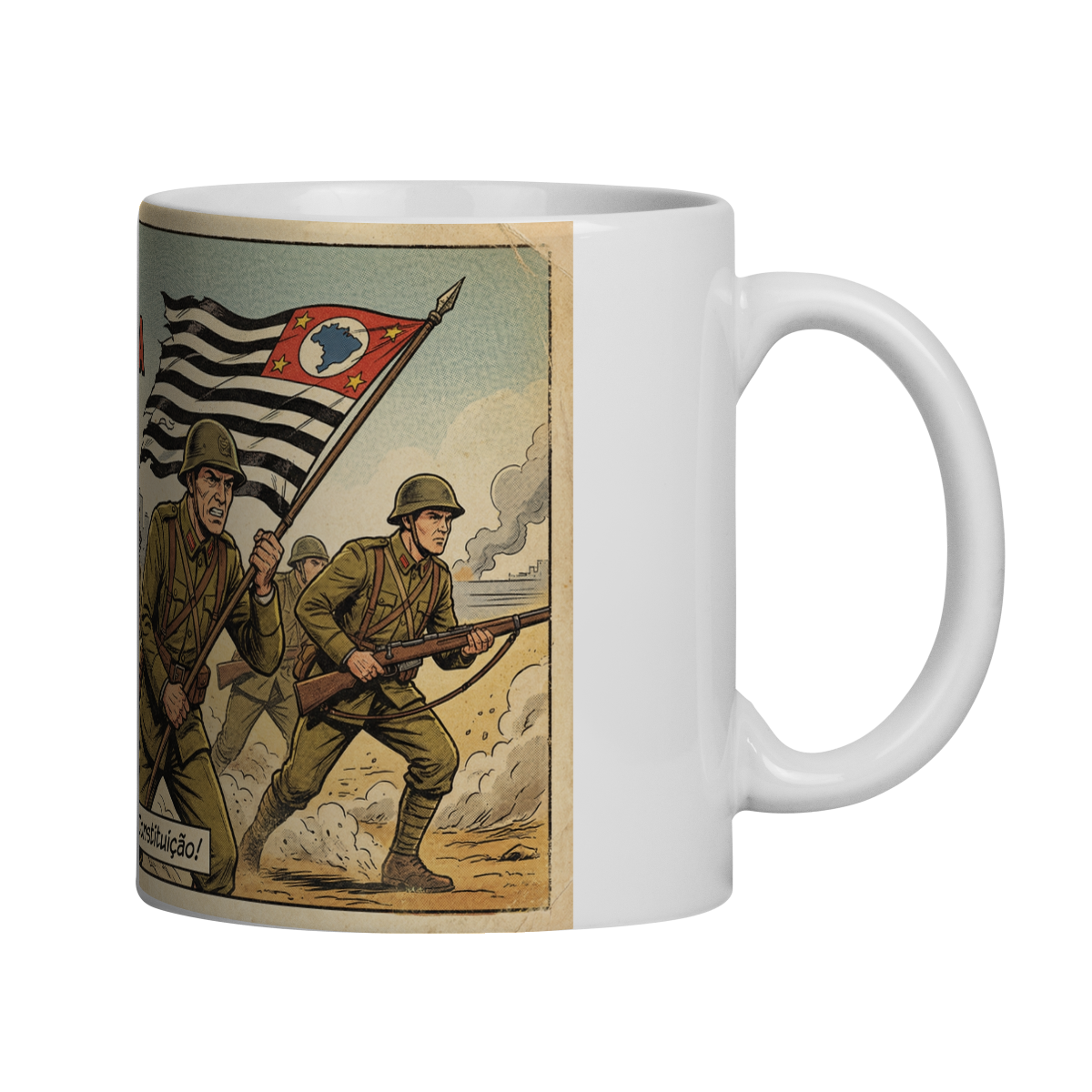 Esta caneca retrata, em estilo HQ clássico dos anos 50–60, soldados avançando determinados sob a bandeira do Estado de São Paulo, simbolizando a luta pela Constituição durante a Revolução de 1932. A estética vintage, com traços marcantes e cores levemente envelhecidas, remete às capas históricas de revistas ilustradas da época.