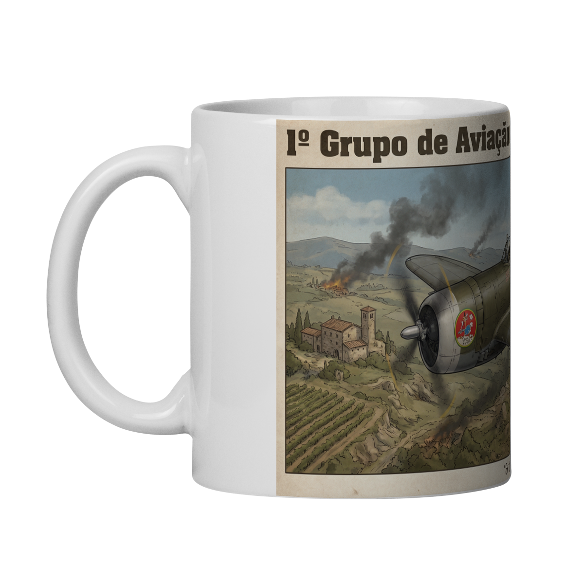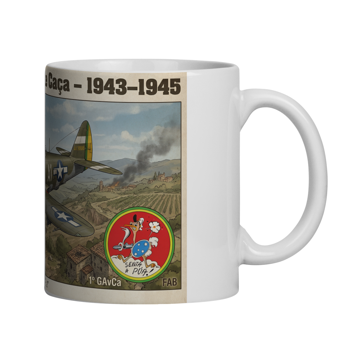 Esta caneca retrata o lendário P-47 Thunderbolt do 1º Grupo de Aviação de Caça da Força Aérea Brasileira em missão sobre os céus da Itália. Em destaque, o emblemático símbolo do grupo — o avestruz com o projétil — e a histórica expressão “Senta a Pua!”, que representa ataque firme, coragem e determinação.