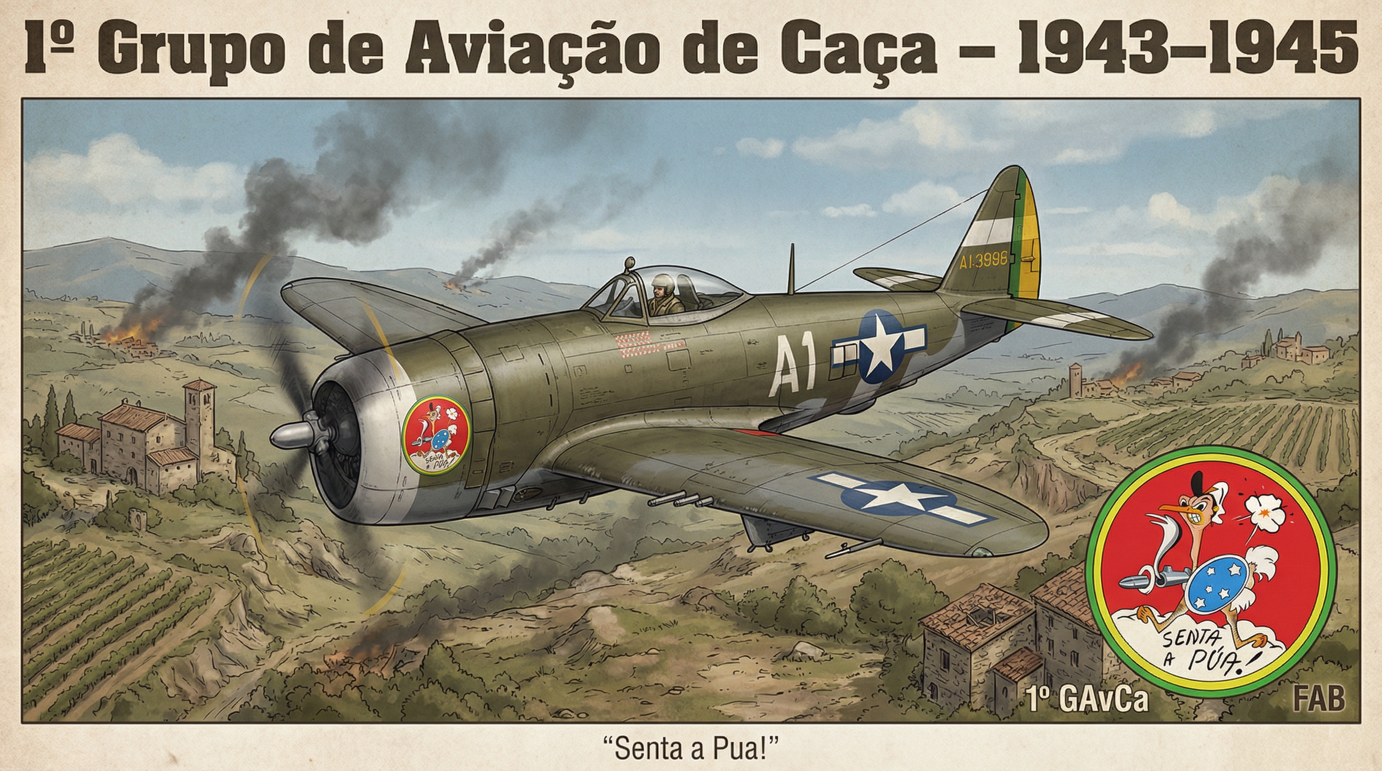 Com estética inspirada em pôsteres militares clássicos, a arte transmite movimento, potência e o espírito ofensivo que marcou a atuação dos pilotos brasileiros entre 1944 e 1945.