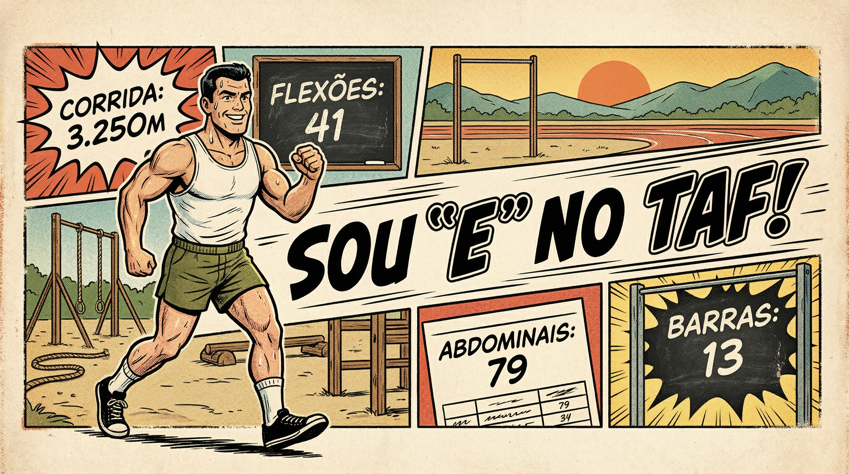 Com arte em estilo HQ dos anos 50–60, ela traz a clássica provocação SOU "E" NO TAF!, acompanhada dos índices que todo militar reconhece de longe: