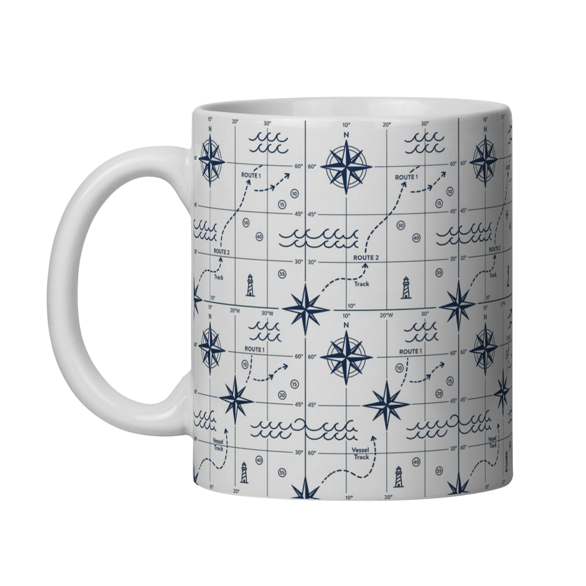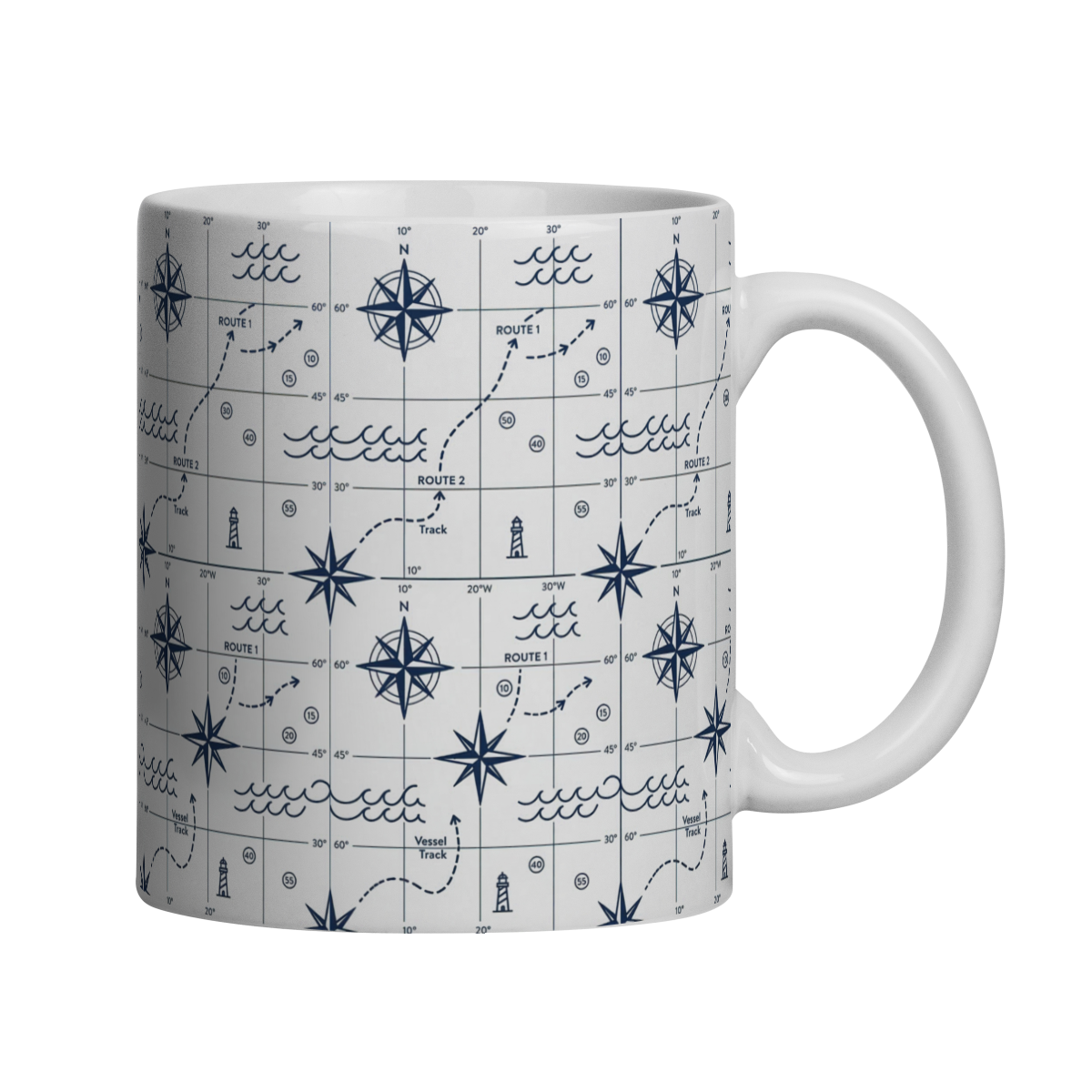 Esta caneca traz uma estampa inspirada nas tradicionais cartas náuticas utilizadas na navegação marítima. O design apresenta uma composição gráfica elegante com rosas dos ventos, rotas de navegação, coordenadas, ondas estilizadas e outros elementos clássicos do universo naval, organizados em um padrão repetitivo que remete aos mapas utilizados por navegadores ao longo da história.