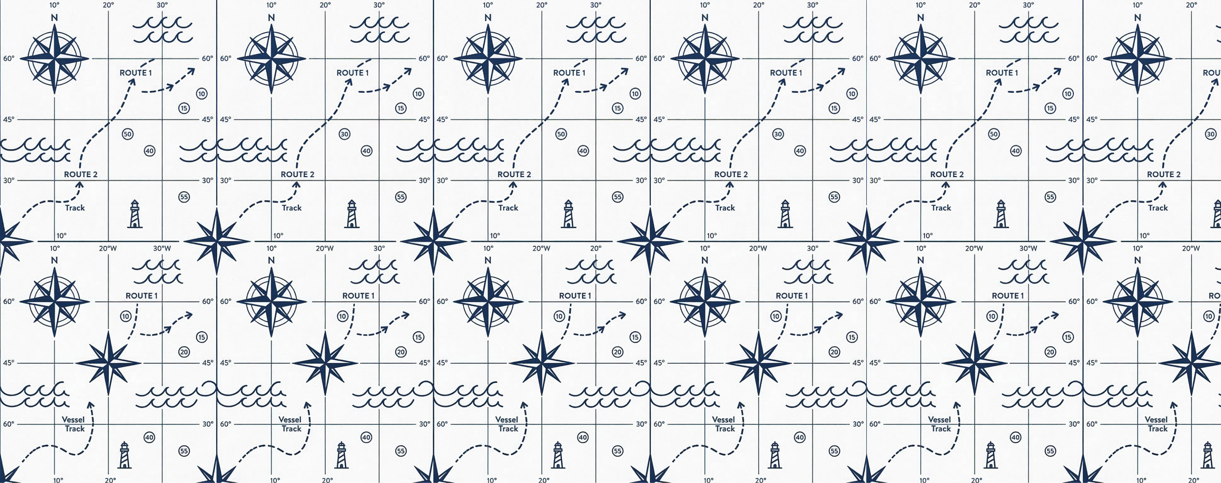 A paleta em azul profundo sobre fundo claro reforça a identidade marítima e transmite a sensação de precisão, orientação e exploração dos mares. As linhas, símbolos e marcações lembram instrumentos de navegação e trajetos traçados sobre o oceano, criando uma estética ao mesmo tempo técnica e sofisticada.