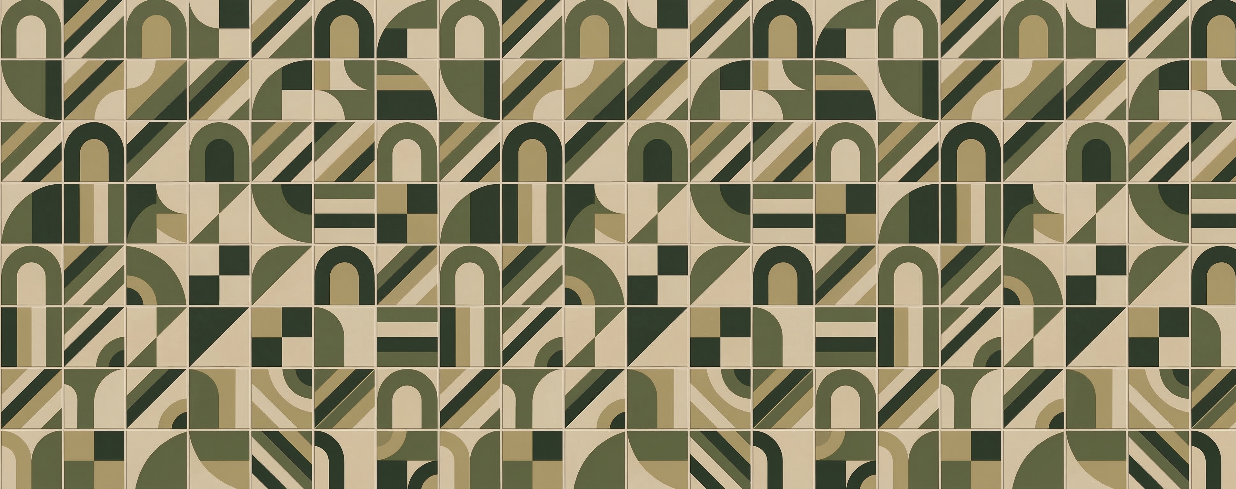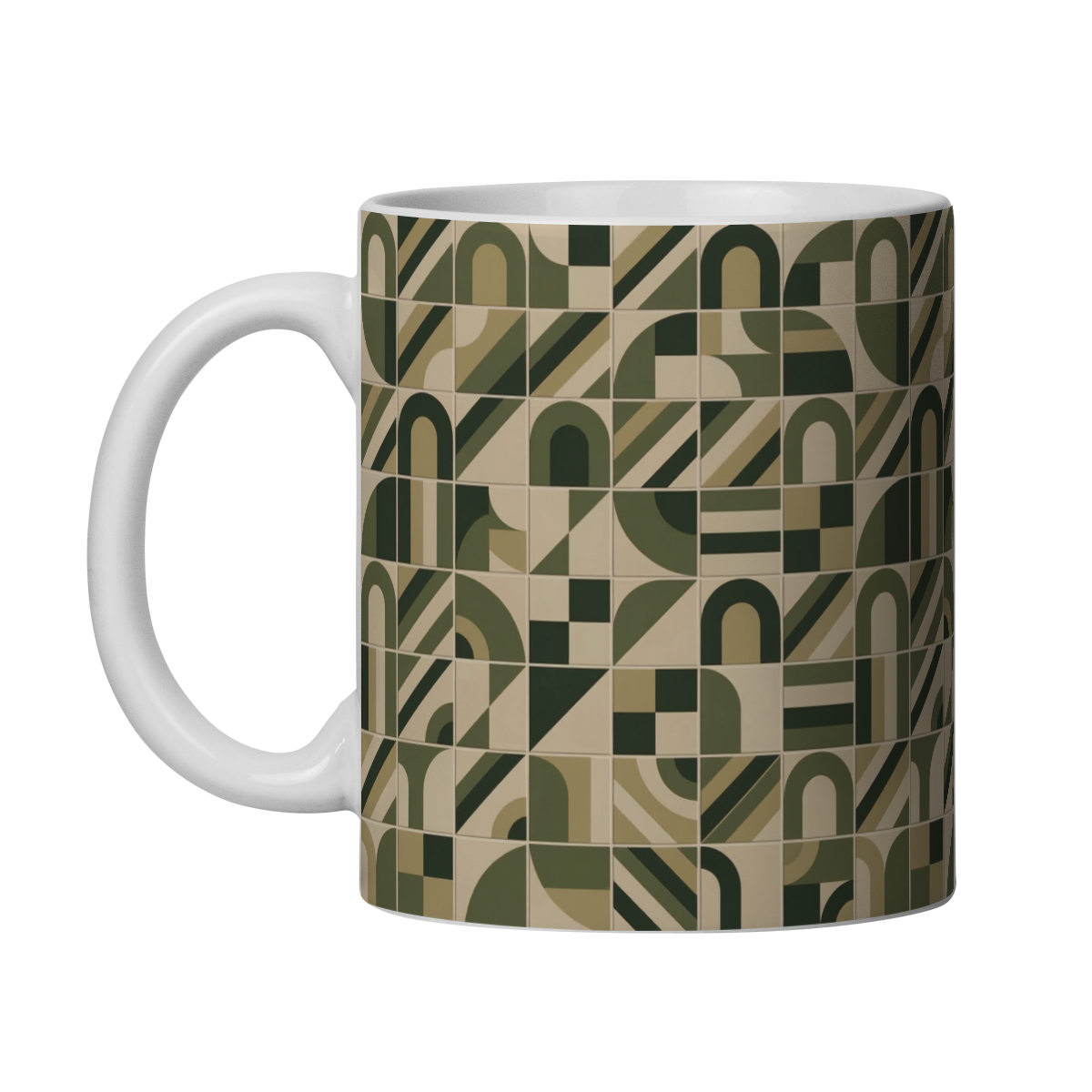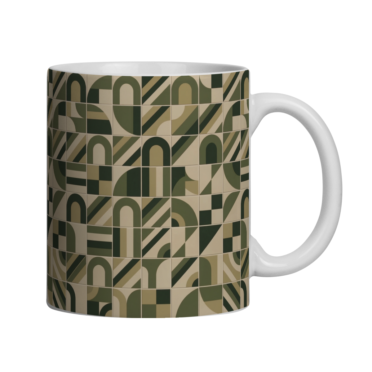 Esta caneca apresenta uma estampa gráfica inspirada no modernismo brasileiro, composta por um padrão geométrico repetitivo em tons militares. A arte combina formas simples como arcos, diagonais e blocos modulares organizados em uma grade equilibrada, criando um visual sofisticado, rítmico e contemporâneo.