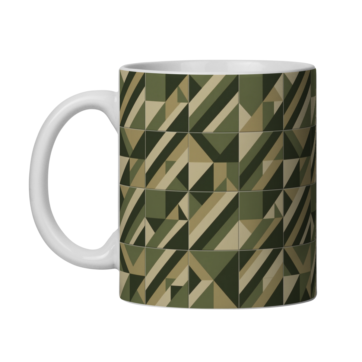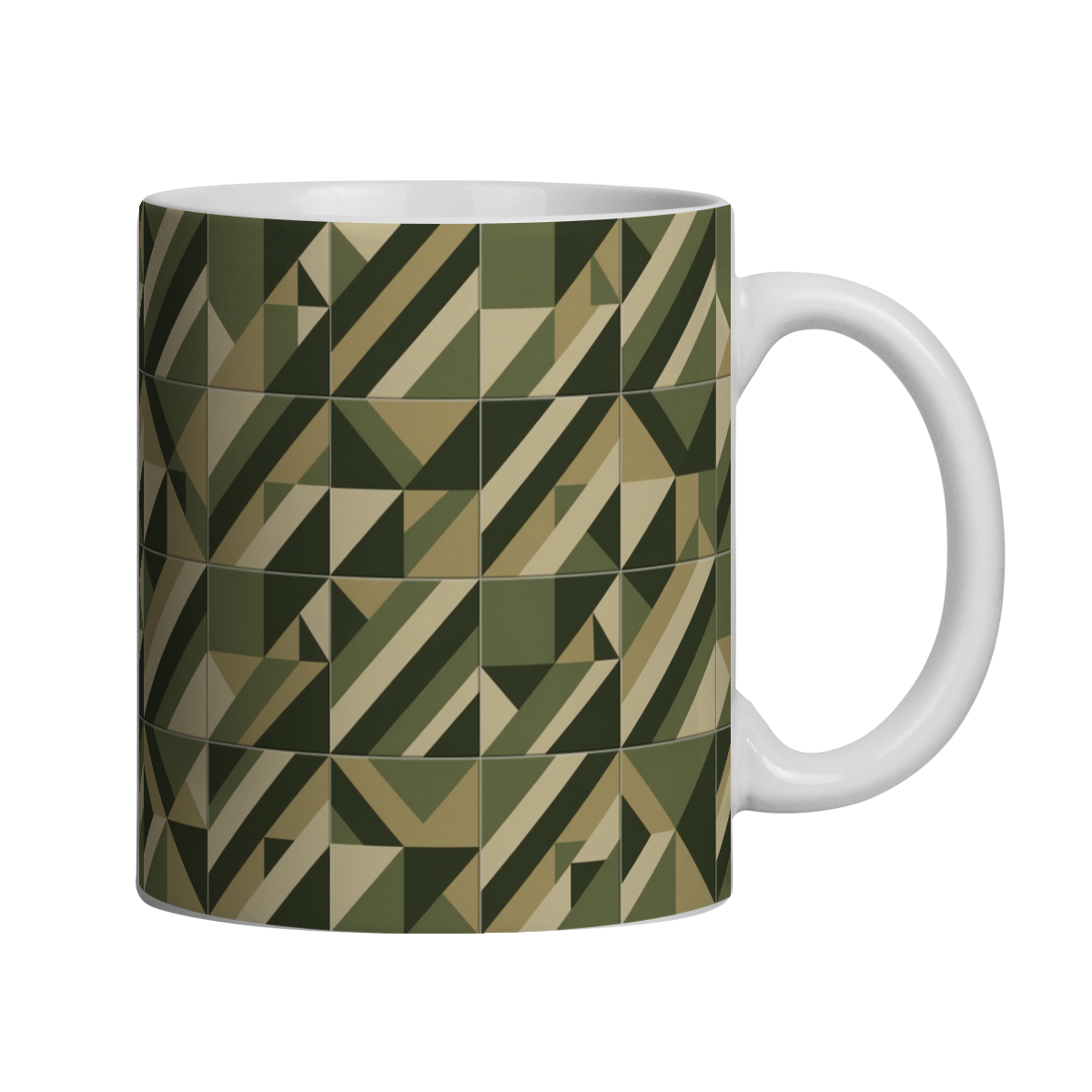 Ideal para quem aprecia design minimalista, padrões gráficos e a sobriedade das cores militares, esta caneca traz personalidade ao momento do café e adiciona um toque de estilo ao ambiente.