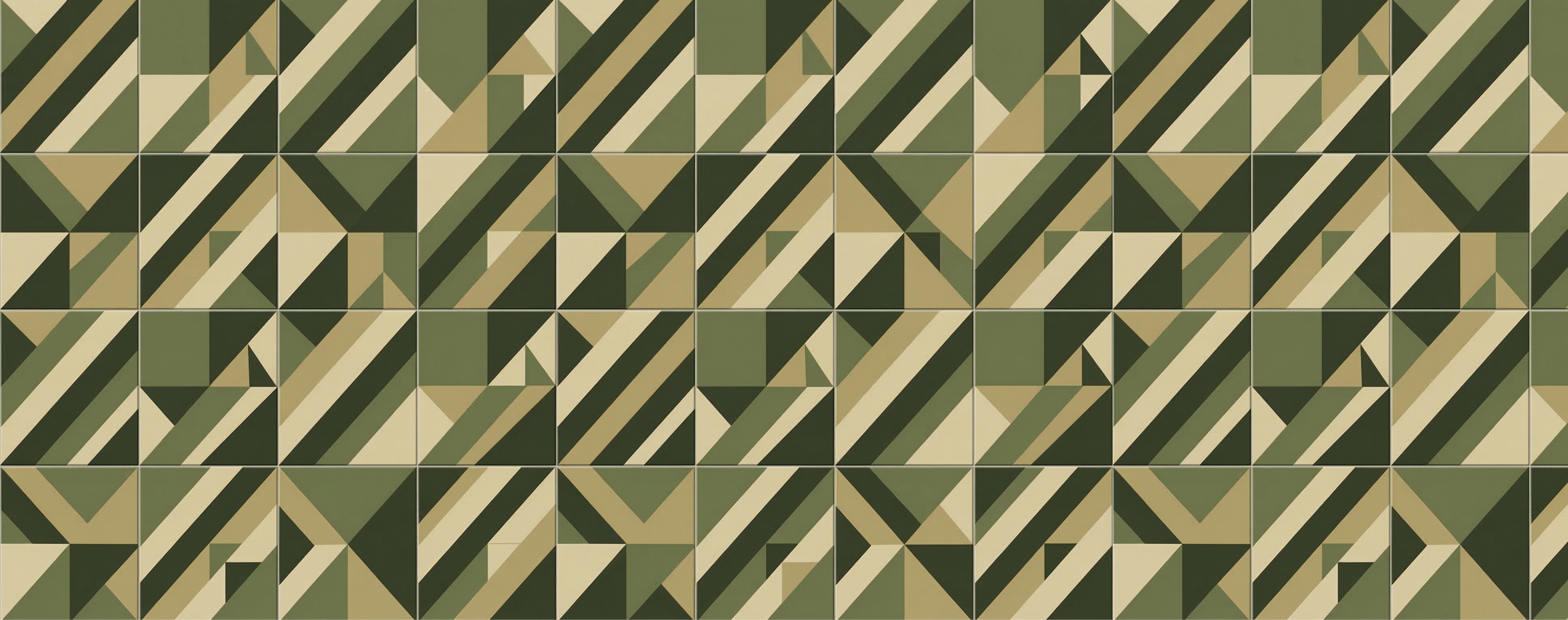 A paleta de cores utiliza tons clássicos do universo militar, como verde oliva, verde escuro e areia, criando uma estética que remete de forma elegante ao ambiente tático sem perder o caráter contemporâneo do design gráfico. O contraste entre as formas e cores reforça a sensação de profundidade e estrutura.