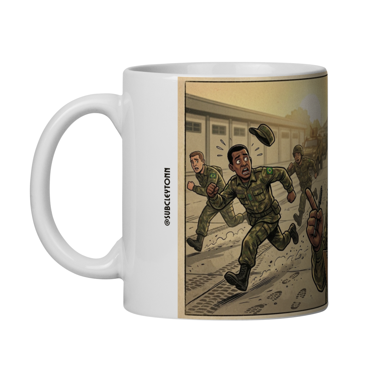 A arte em estilo HQ vintage captura o momento exato do pânico coletivo: coturno levantando poeira, boina voando e dignidade ficando pra trás.